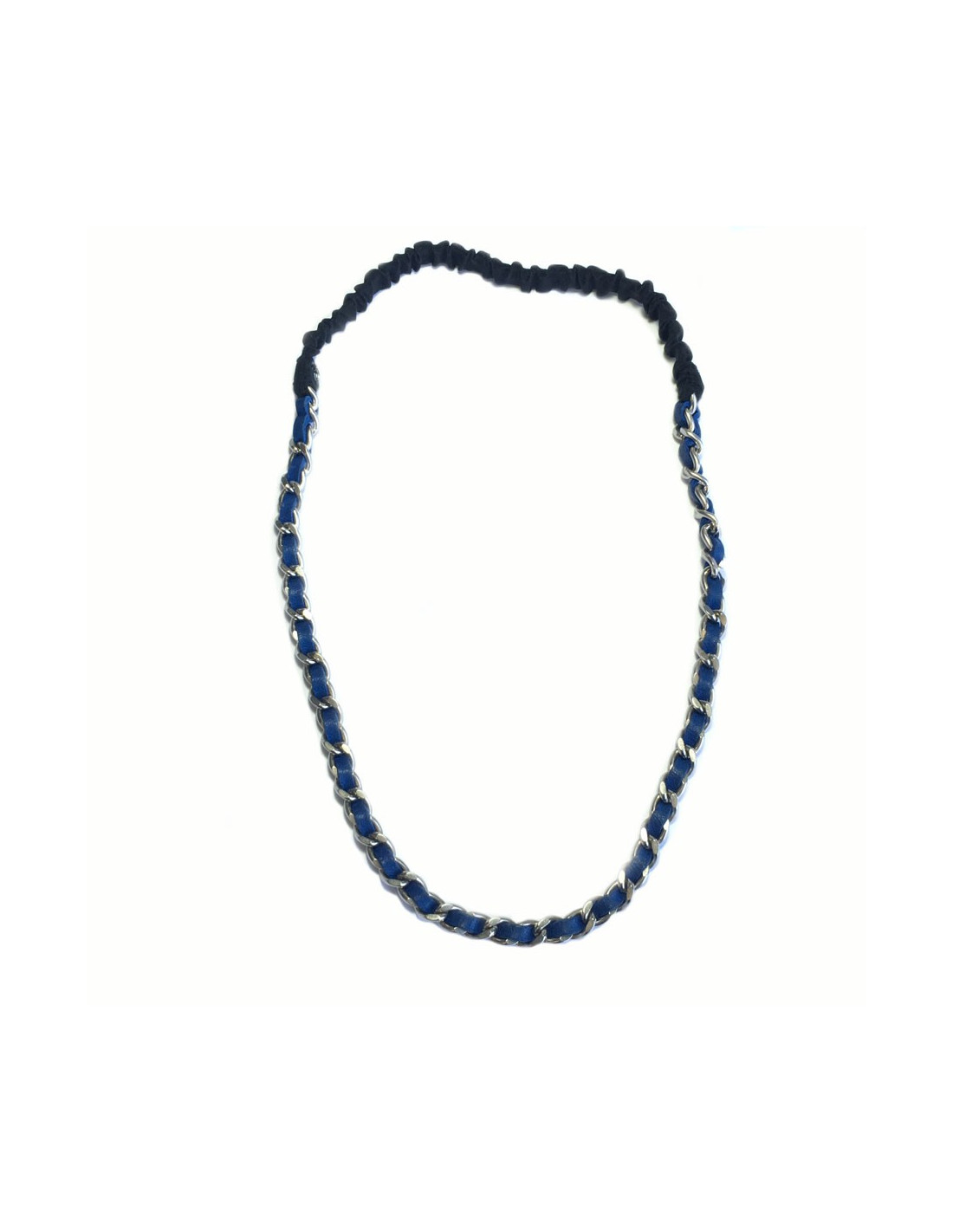 Gorgeous headband or CHANEL headband. Chain silver metal and blue striped leather. Black fabric covered elastic headband. A CC silver on the elastic edge. Never worn.