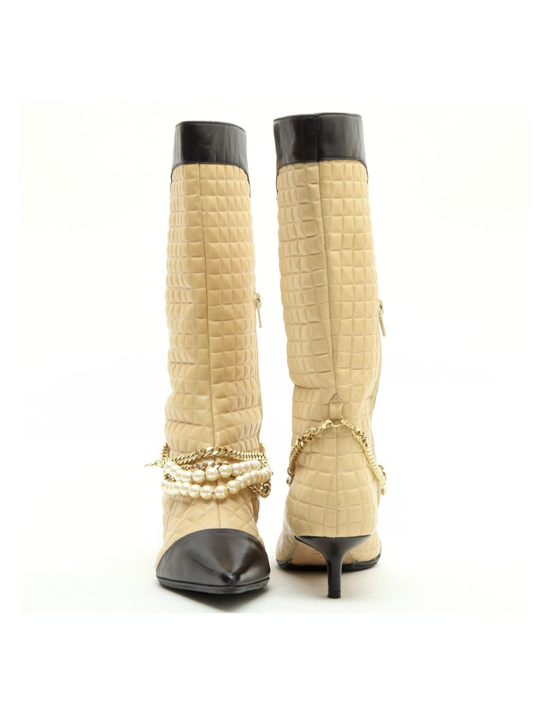 CHANEL mid-boots in beige leather, chain, beads size 38