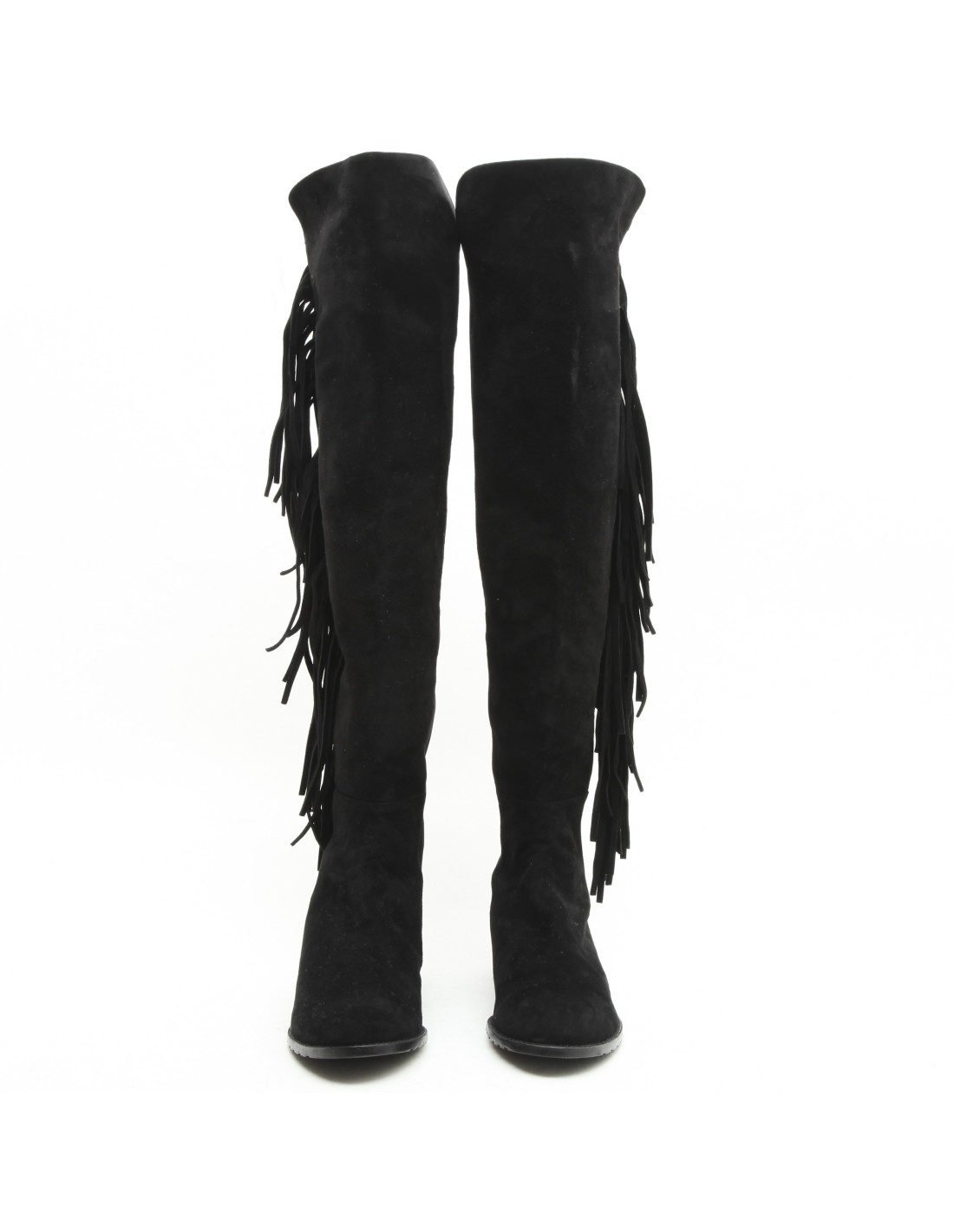 Beautiful Stuart Weitzman pair of fringed boots, current trend, in black suede and stretch.