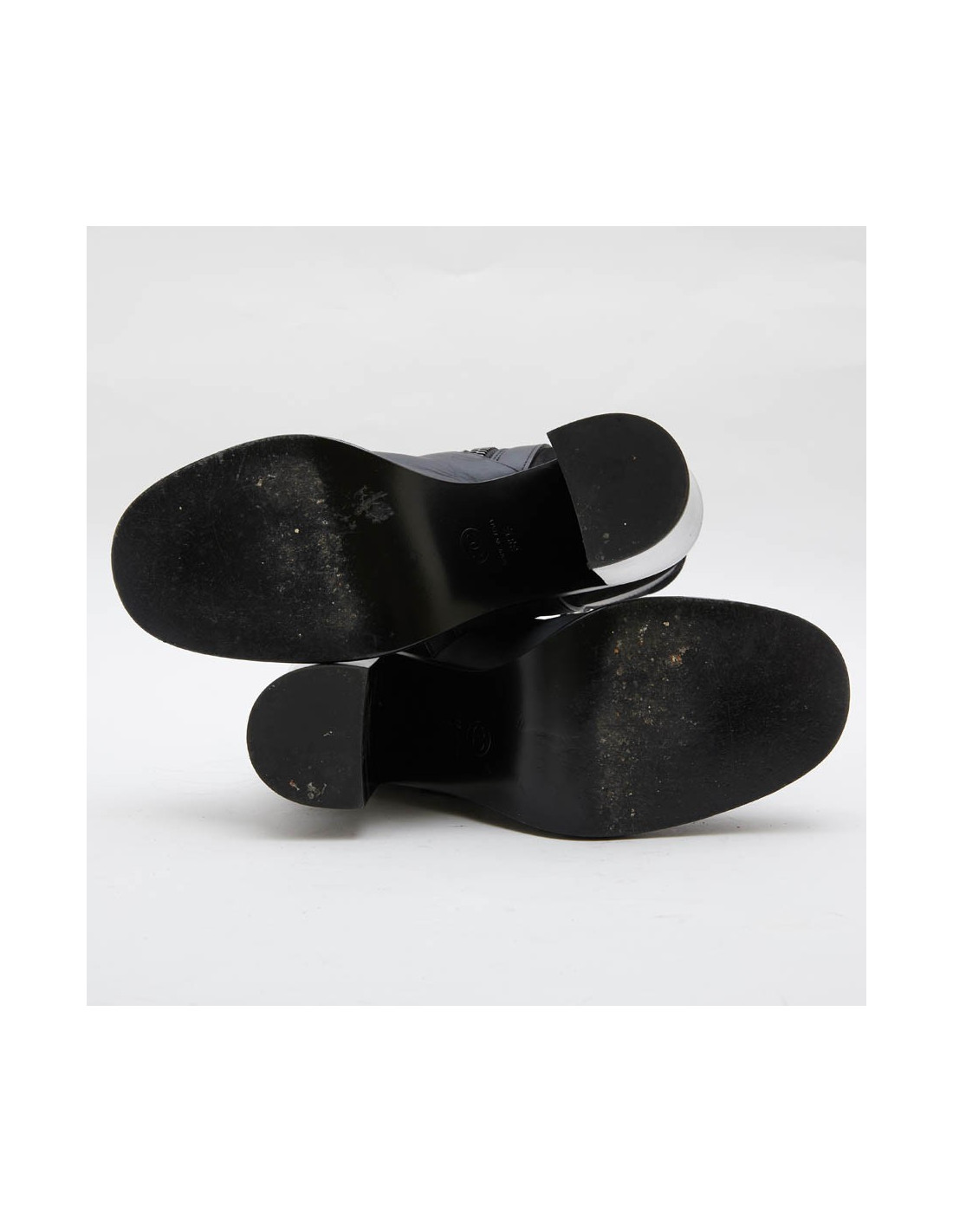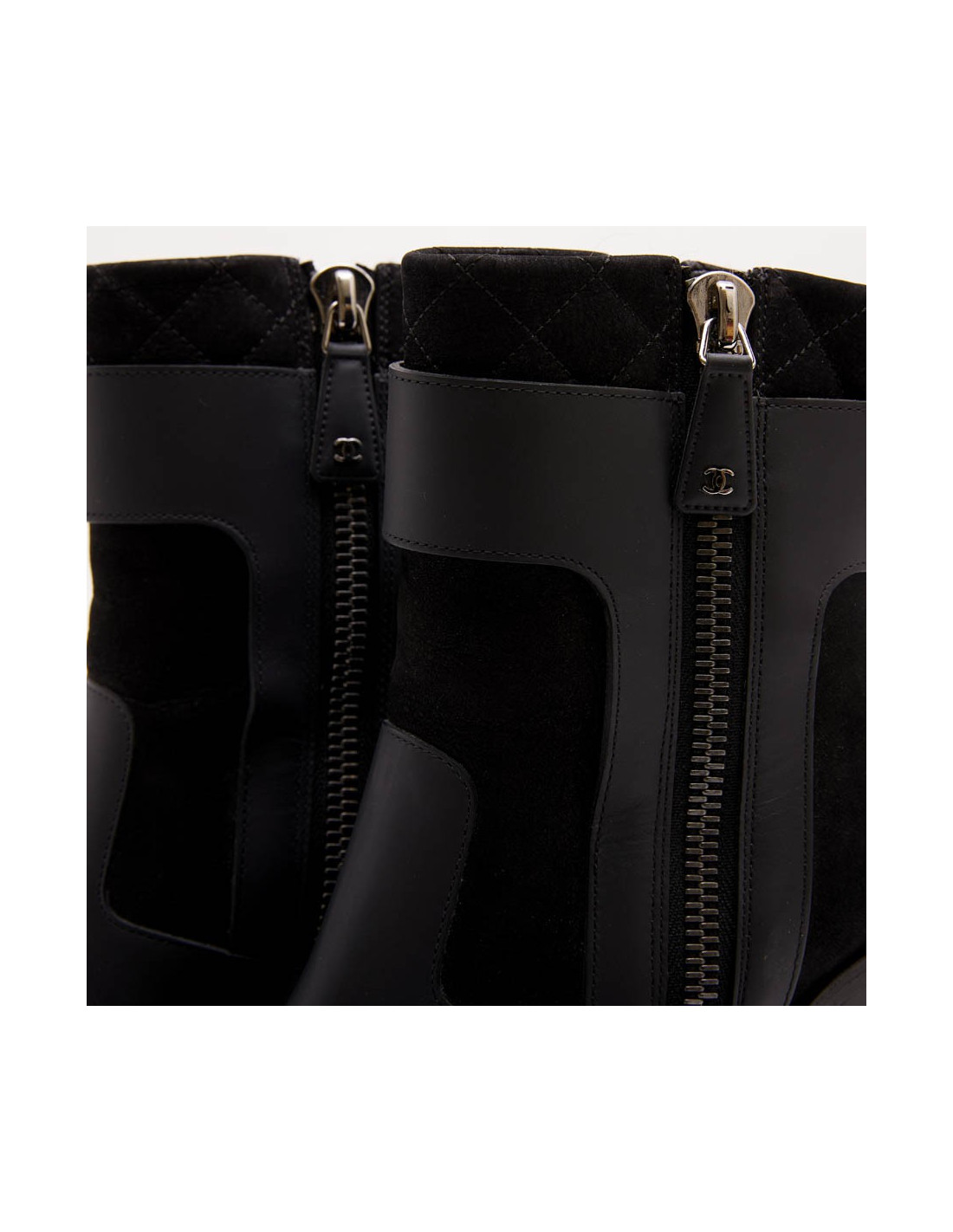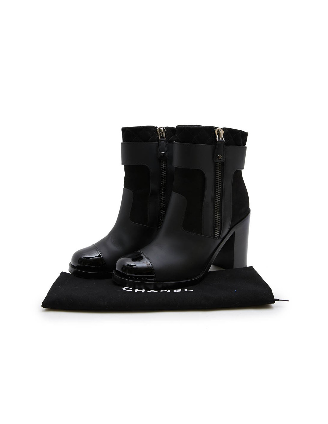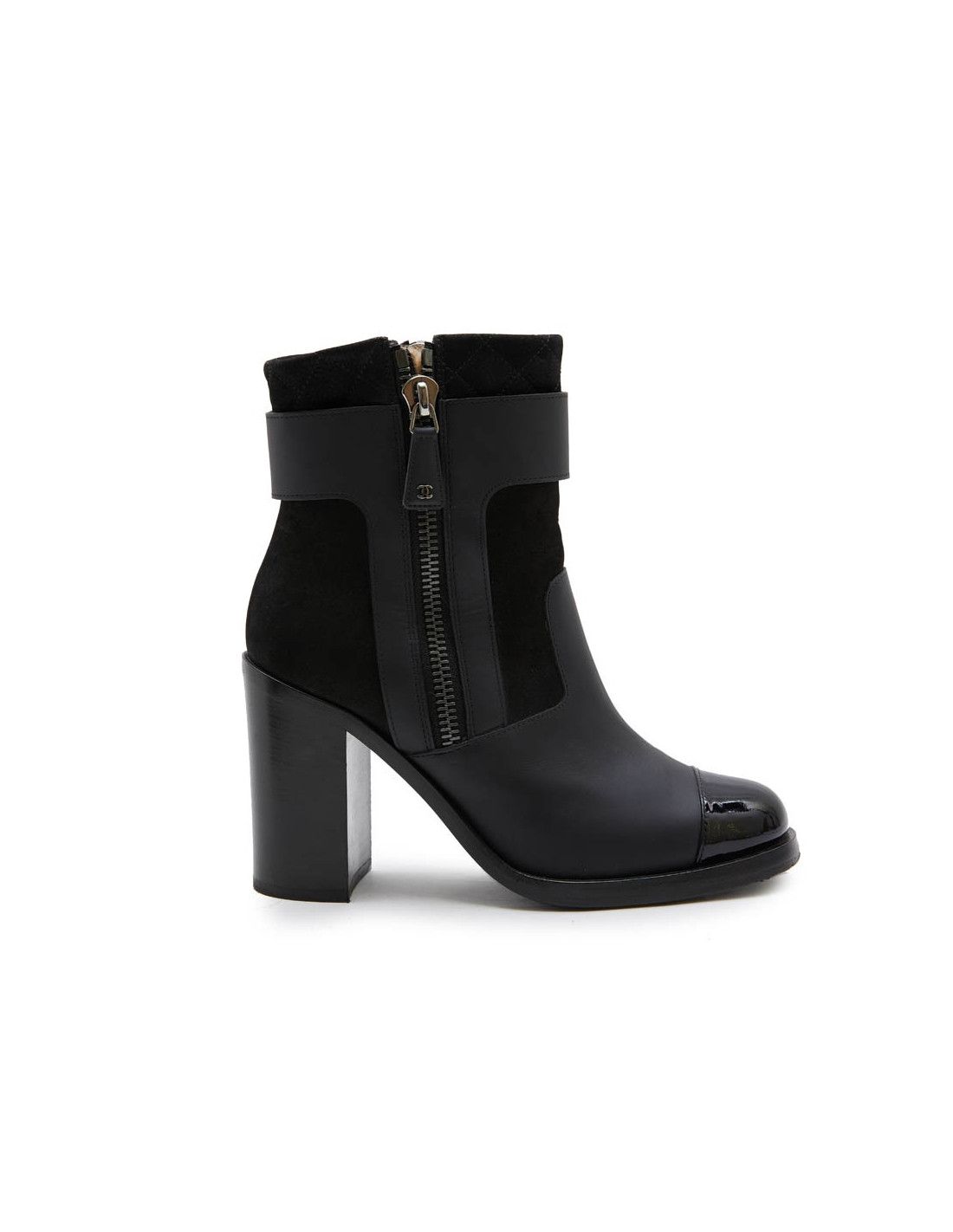 Chanel ankle boots in black leather. Silver metal hardware. The tip is in black patent leather. Alpaca inside. They close with a zipper on each side of the ankle.