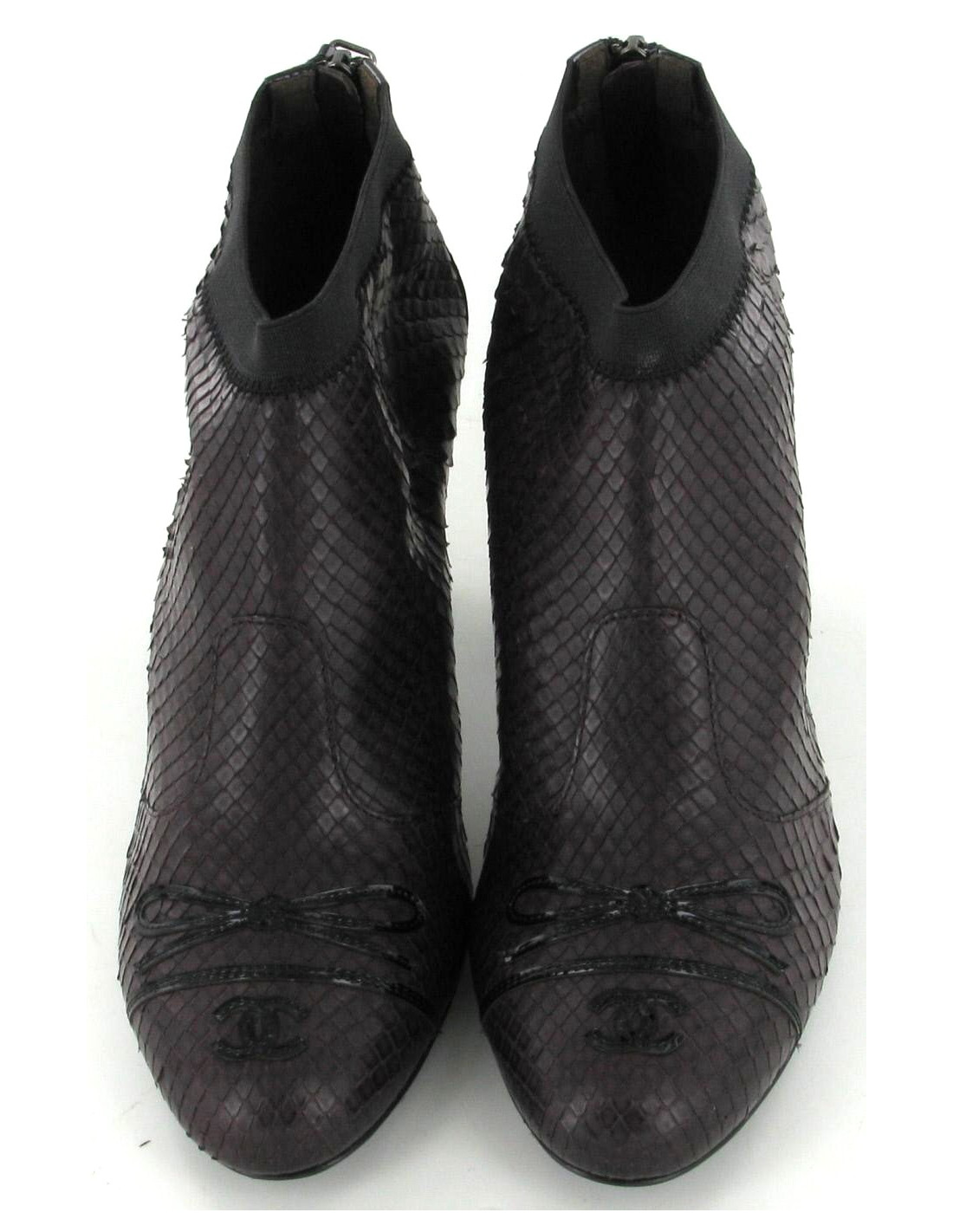 CHANEL boots in natural python, plum color, size 36, new. This sublime pair of boots dress with elegance and originality your winter outfits. On the front of the foot, a CC and a pretty knot Black patent leather are embroidered. Padded bottoms. The ankle will be well maintained by an elastic band. The heel and the back of the foot are black patent leather, rappelling at the front of the shoe, to bring a chic to this essential to the season. Sold in their original box. Made in Italy.