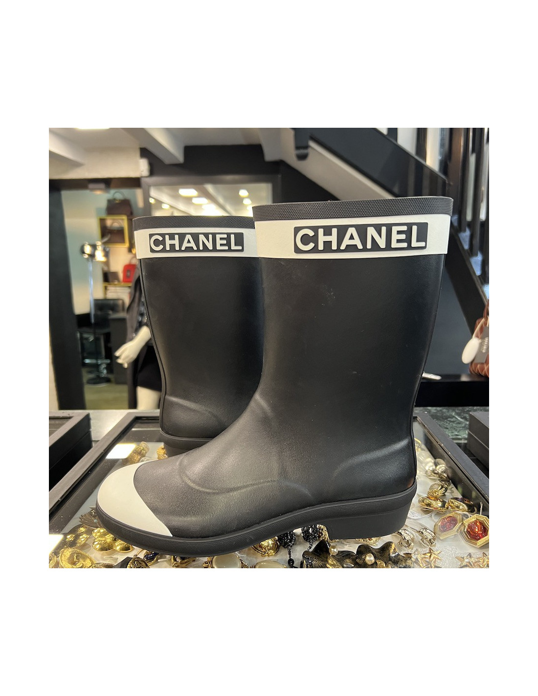 Last items in stock BOOTS CHANEL boots with removable white gaiters size 37FR CHANEL 33529 2,500.00 € CHANEL Collector boots with removable white gaiters size 37FR Condition :very goodMade in ItalySerial number : G38...Material : leatherColors : white, black, goldSize : 37Hardware : gold finish metalMeasurements : Heel : 4,5 cm, uper : 42 cmDetails : quilted removable gaiters with. Black stripe along the ankle with CHANEL written on it. Collector's... Add to cart