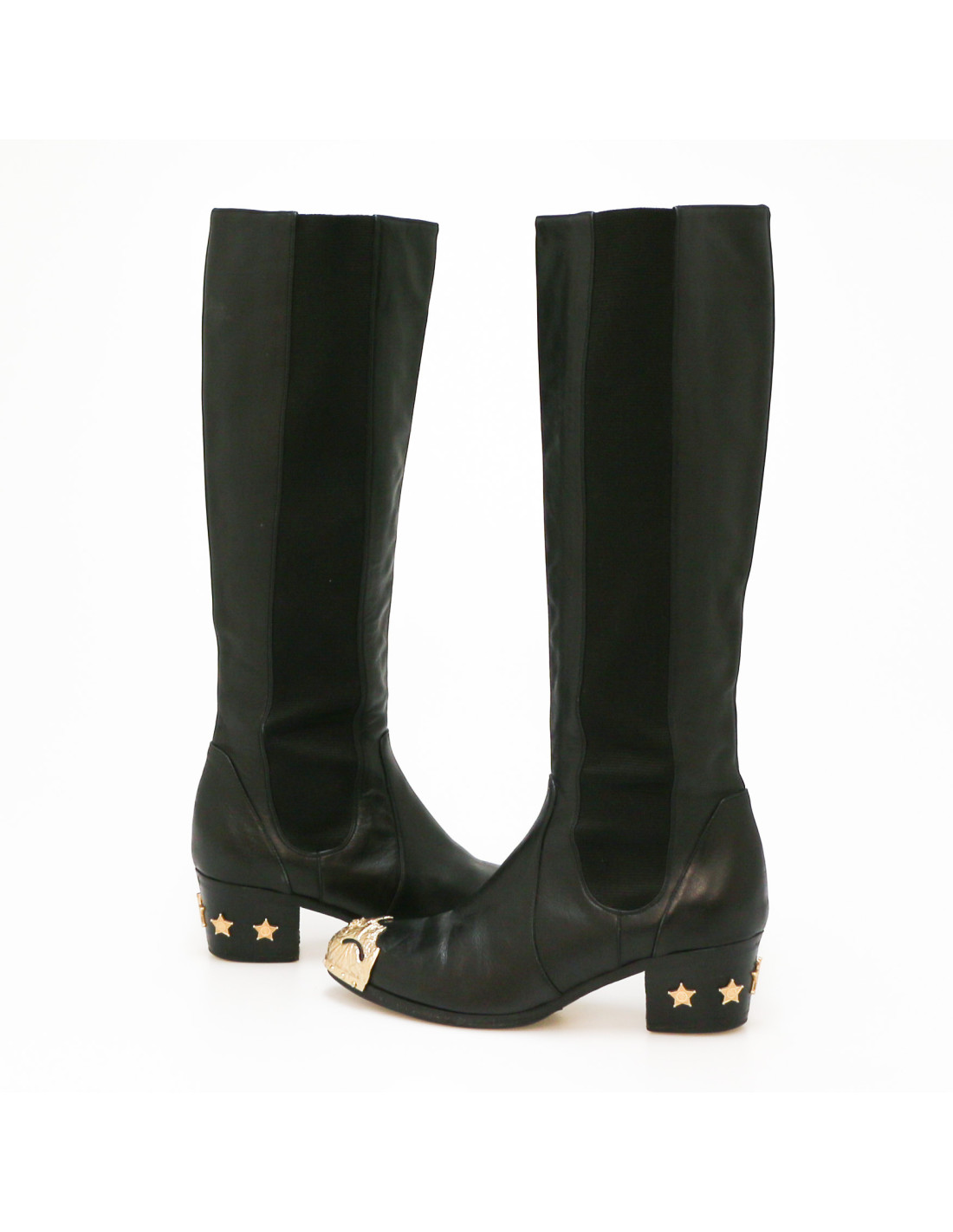 Details : boots with metal inserts that remind us of the cowboy spirit of the collection. Leather and elastic uppers