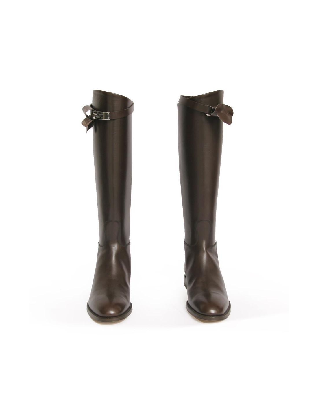 Beautiful pair of boots jumping of Hermès box Mocha leather. The buckle is in ruthenium. Genuine leather sole. Size 40. New condition.