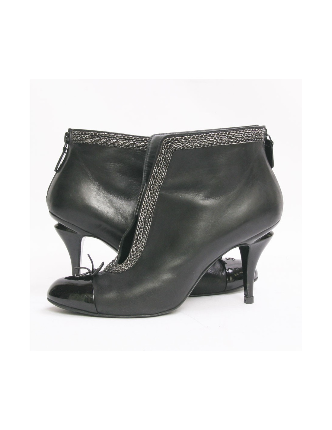 Boots to heels Chanel Black lamb leather and silver chains. Size 39. Zipper at the back of the shoe. The end is black patent leather with the initials "CC" silver metal. In very good condition.
