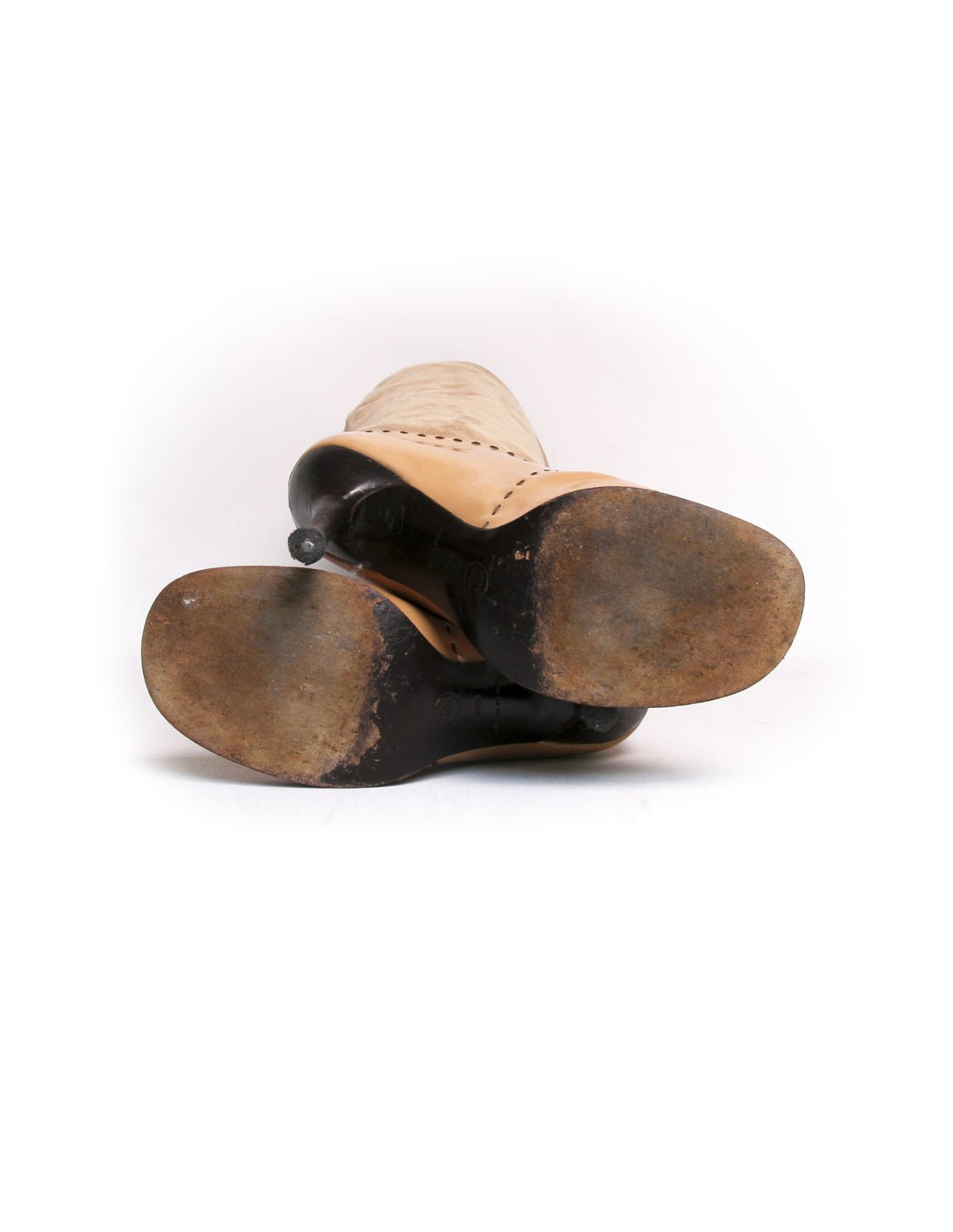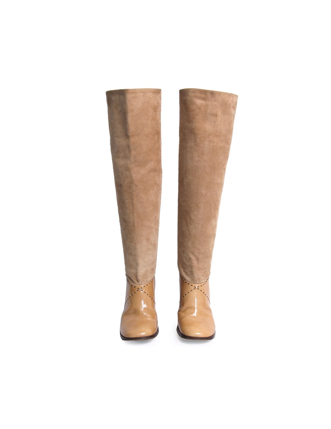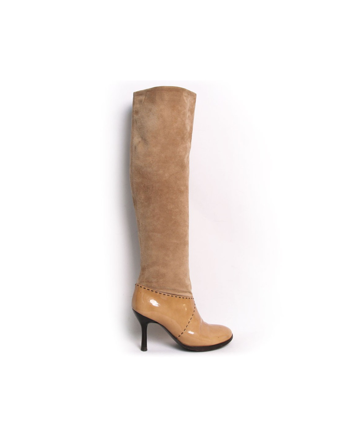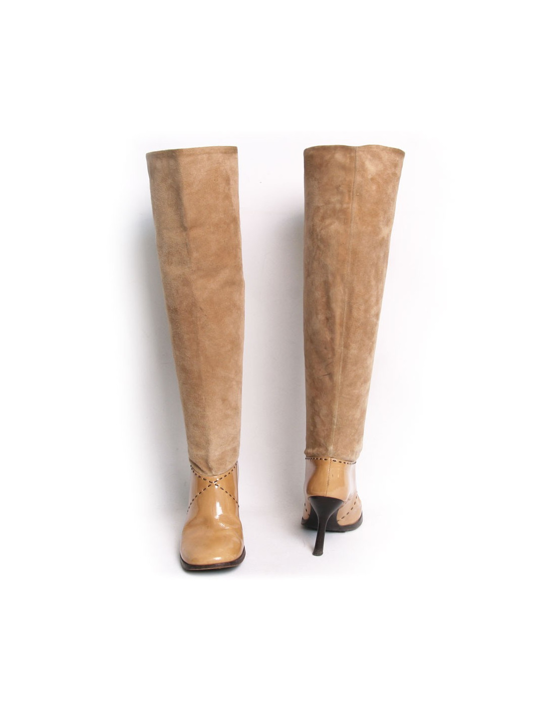 Chanel heels in beige suede and patent leather boots. Size 39.5. Topstitching are dark brown. The heel is fine. The Chanel logo is registered at the top outside of each boot. In very good condition. Light small black marks on suede of the left shoe but very inconspicuous. Slight fold to use at the front of the boots wear. See photos.