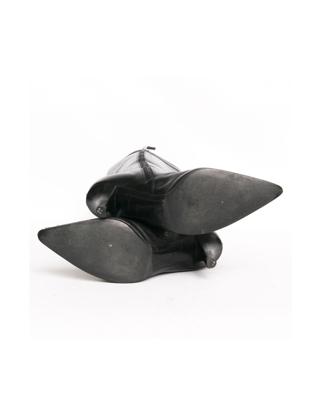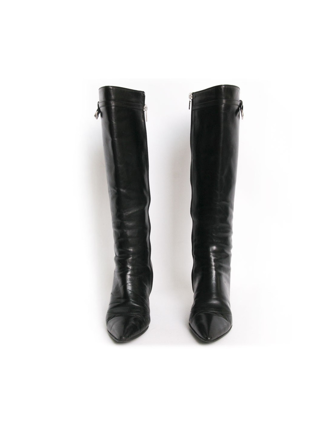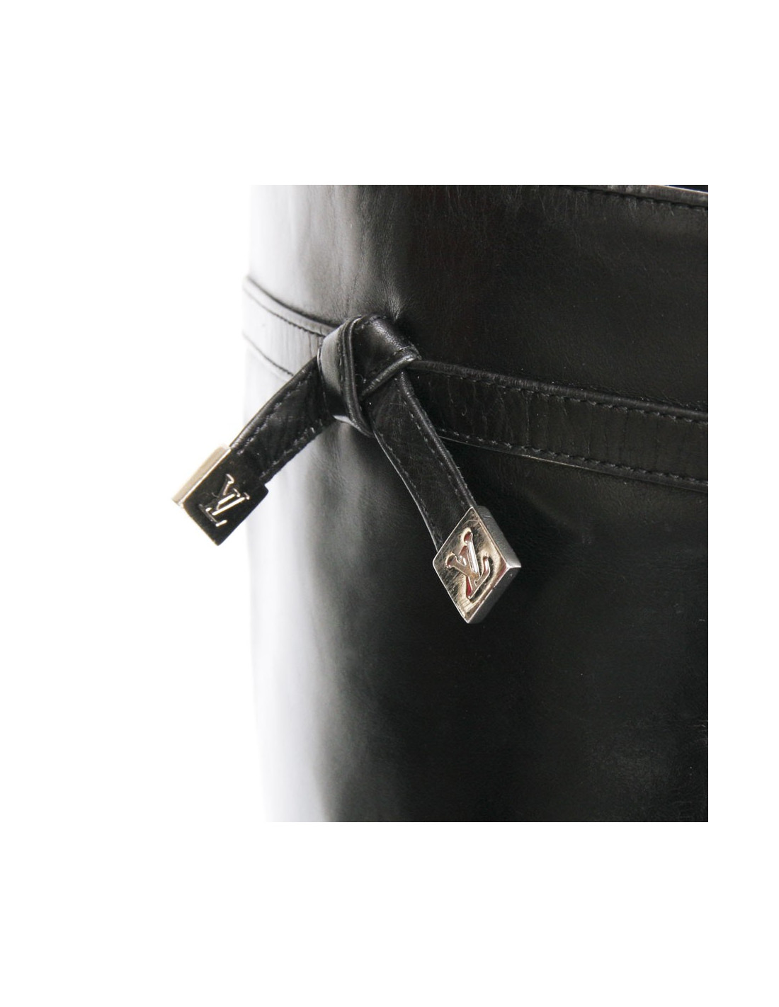 Lovely pair of boots Louis Vuitton black lamb leather. Size 36 1/2. Pointed tip. Small heel. Zipper inside the boot. Little knot leather on top with the silver initials LV metal tip. In good condition. The heels are slightly damaged and 3 small signs of wear on the tip of the right boot. See photos.