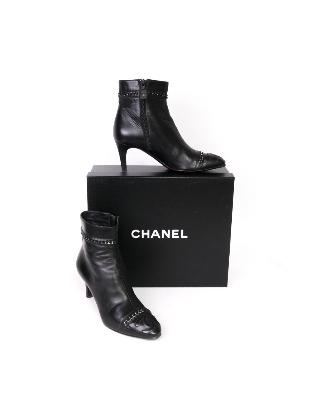 The House of Chanel black leather boots. The "CC" logo is embossed on the front of the shoe. Two bands with the famous Chanel metal chain silver at the level of the ankle as well as the front. Zipper inside the shoe. Size 37.5. In very good condition. Very light scratches on the heel, but very little visible.