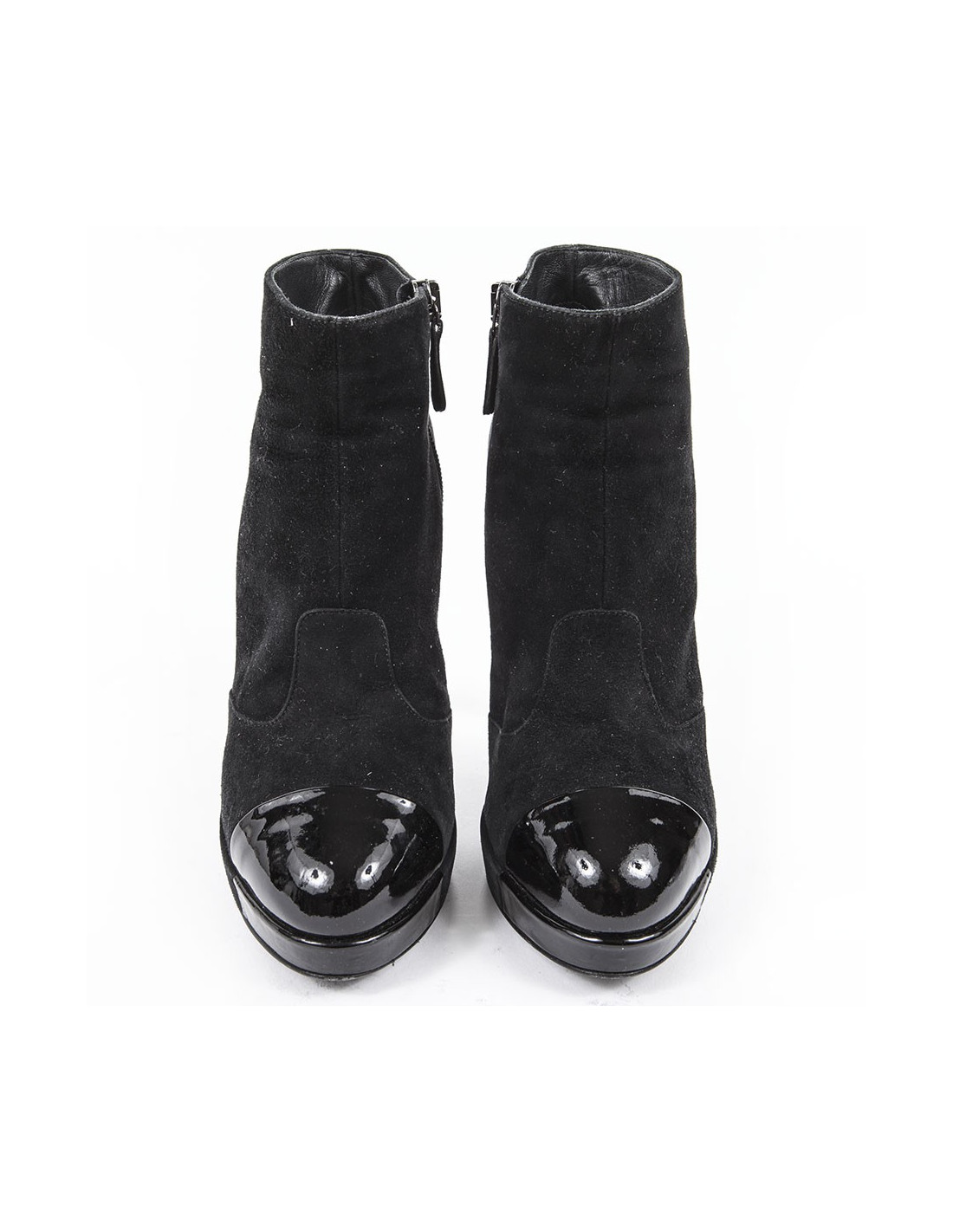 Boots at heels of the House of Chanel in black suede and patent leather black tip. Size 36.5. Zipper inside. In very good condition. Slight wear to the platform and heels. See photos. Hlogramme: D G27...