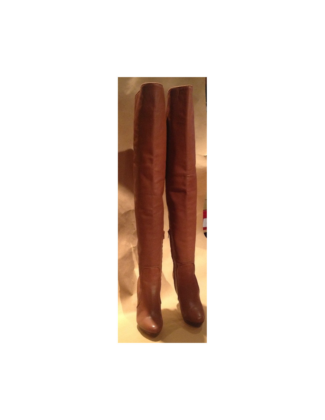 Superb waders AZZARO "Gypsy boots" brown leather T 39. Insole length: 26 cm. Outside width: 7 cm Height heel: 12 cm. Pad height: 1.5 cm. Height: 63 cm Zipper inside the foot, heel and brown varnish slider, very light scratches on the leather Public price: 1460 EUR Little worn. Delivered in their box