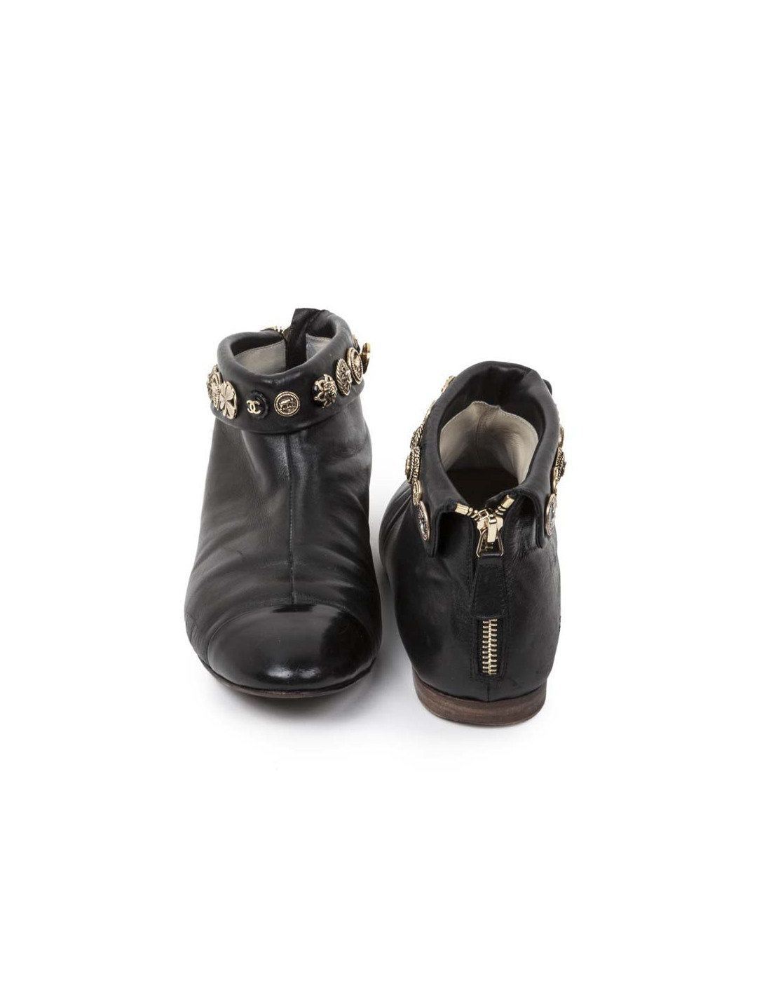 The House of Chanel in smooth black leather boots and black painted tip. The acronyms 'CC' buttons are gold metal. Size 39.5. Zipper at the back. In good condition. Wear the boots on the inside at the back. Leather insoles.
