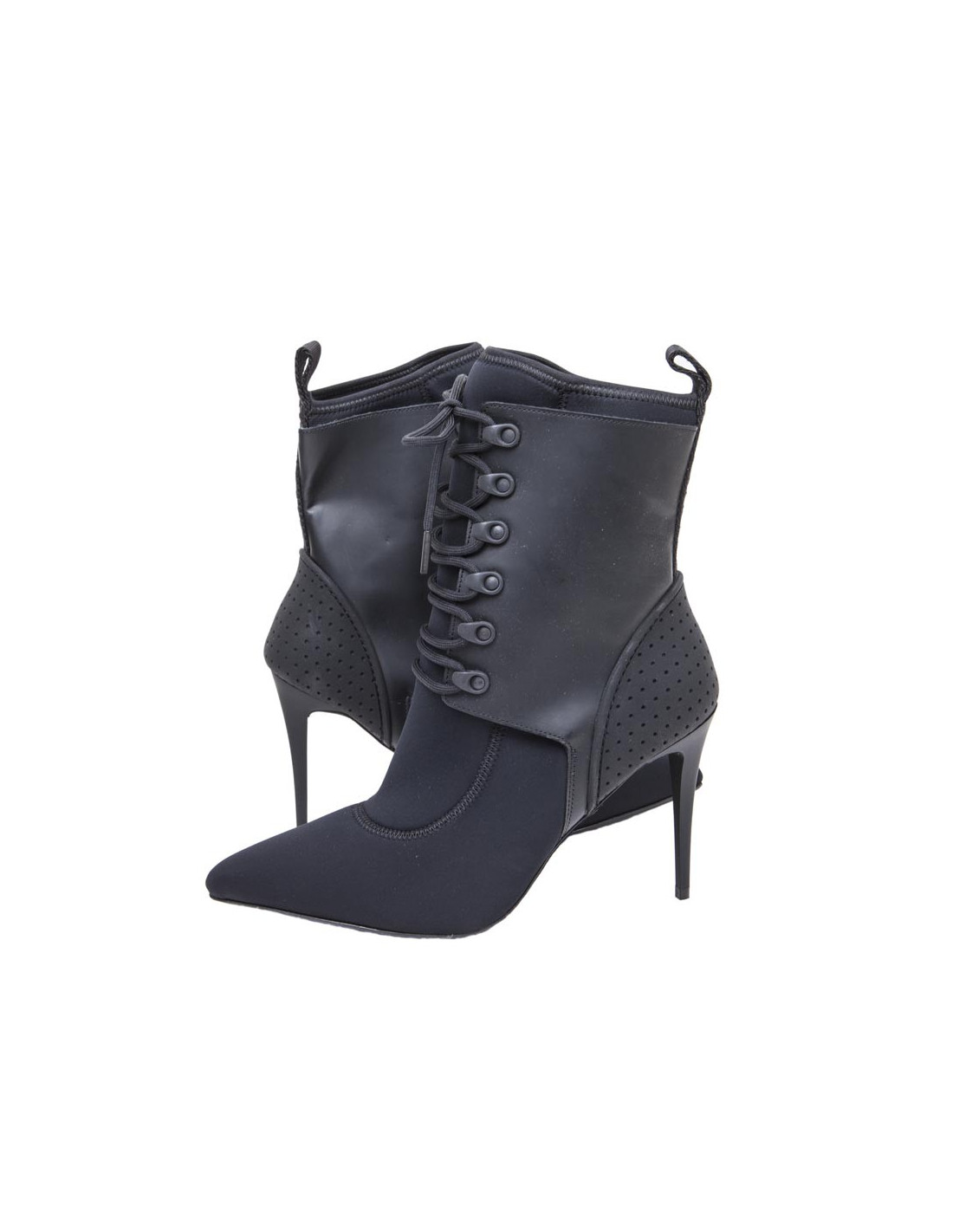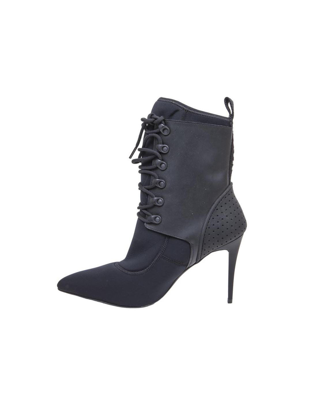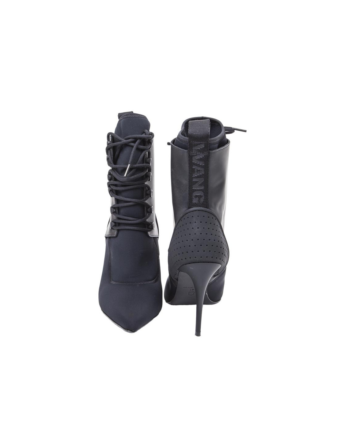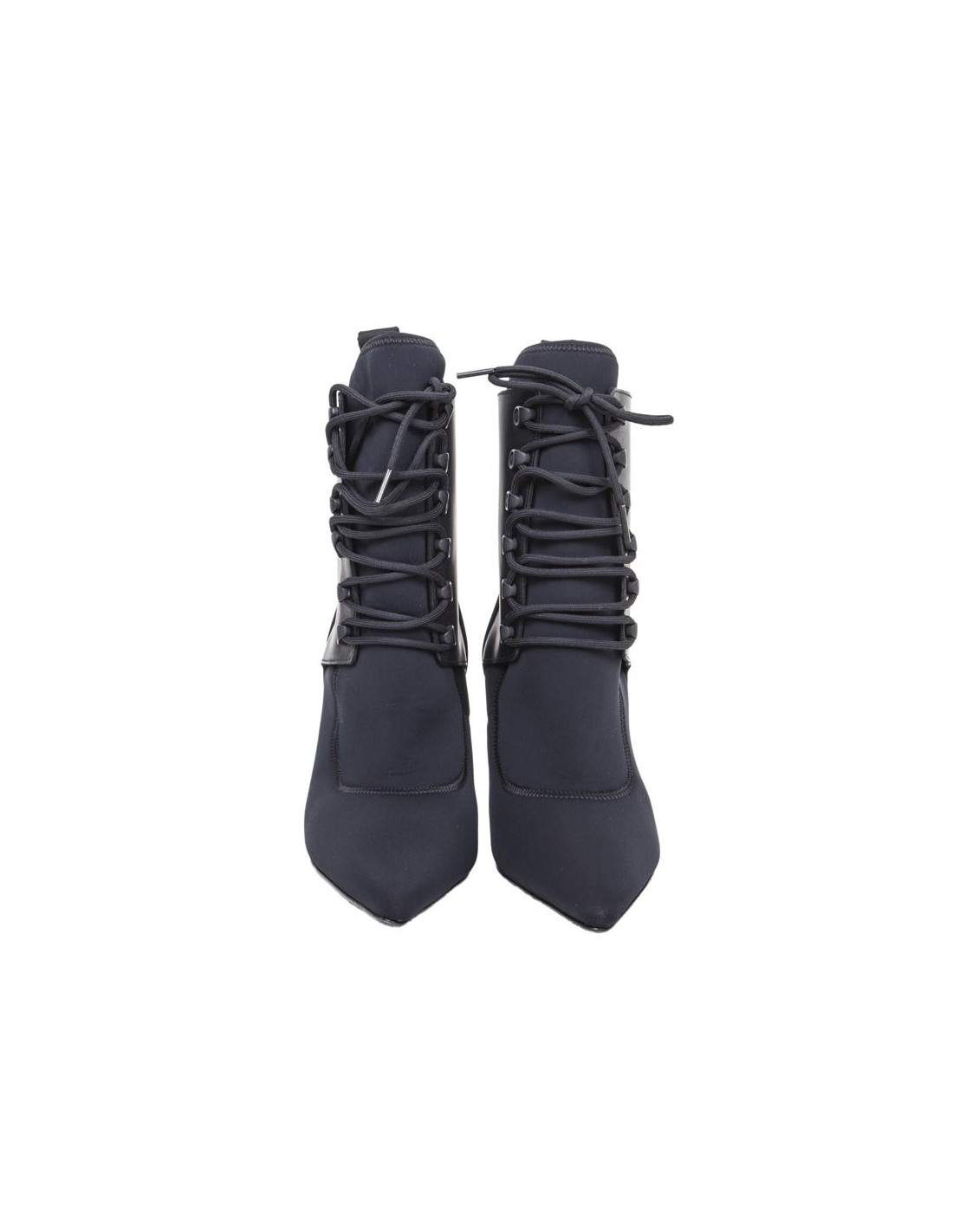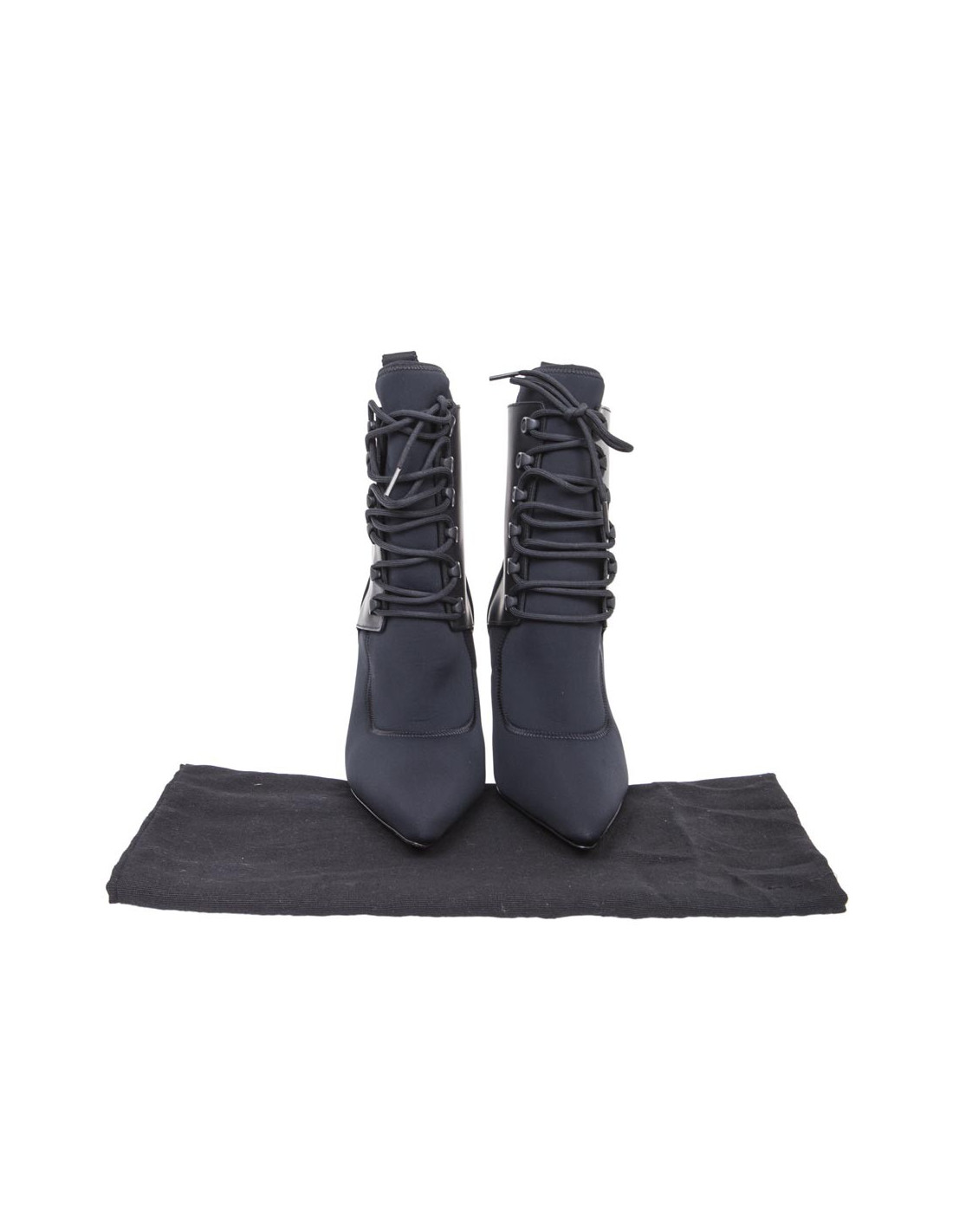 ALEXANDER WANG ankle high heel boots in thick black synthetic fabric with lacing at the front. There are details at the back of the heel.