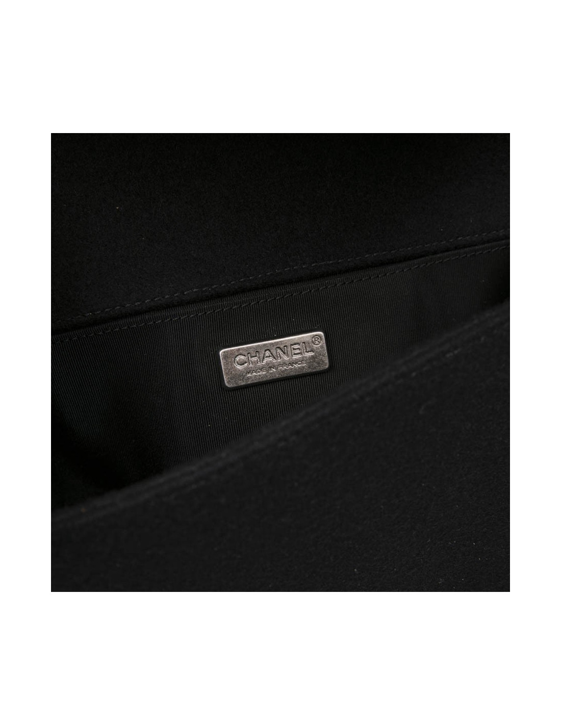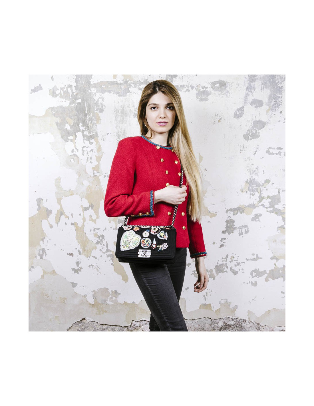 Chanel Boy bag in black boiled wool with embroidered patches.
