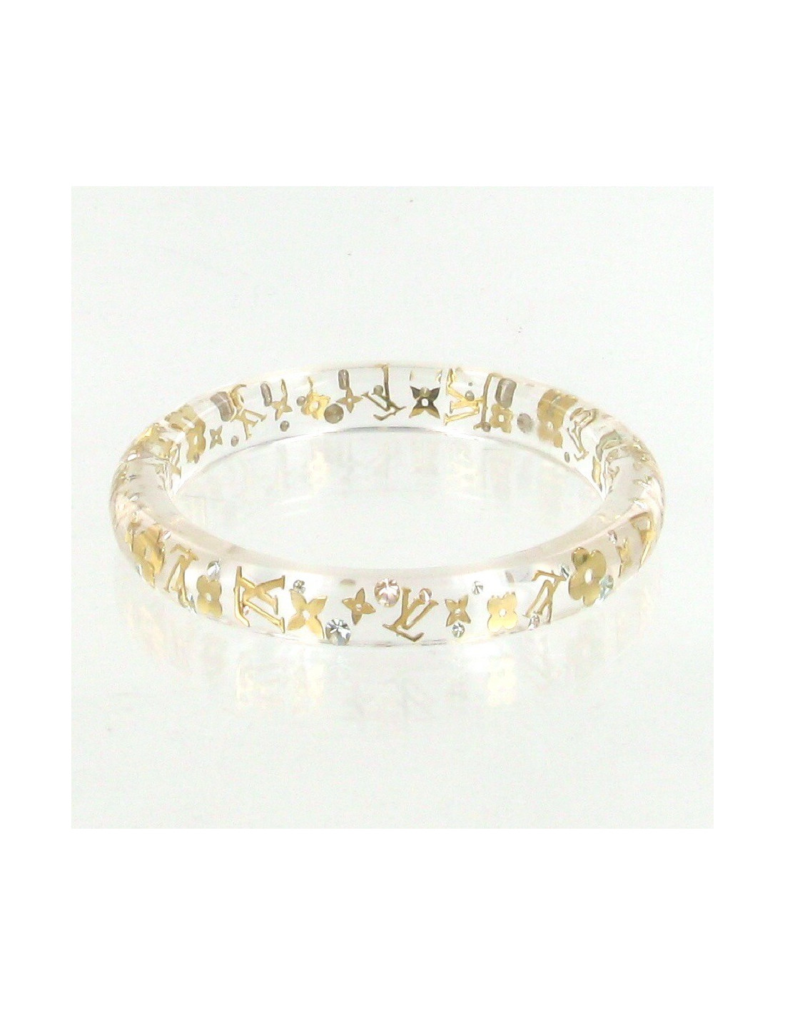 Pretty LOUIS VUITTON bracelet in transparent resin encrusted Swarovski and the elements of the Monogram Golden brass. Belongs to the Vuitton Collection: Monogram Inclusion. There is a small micro scratches