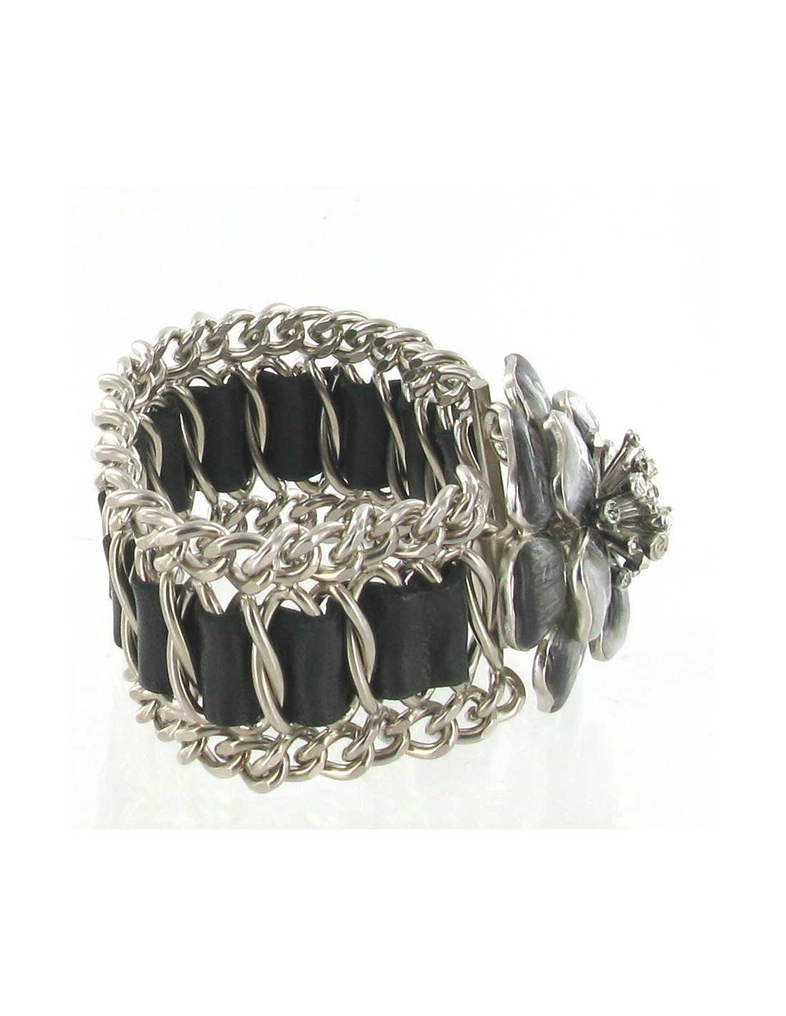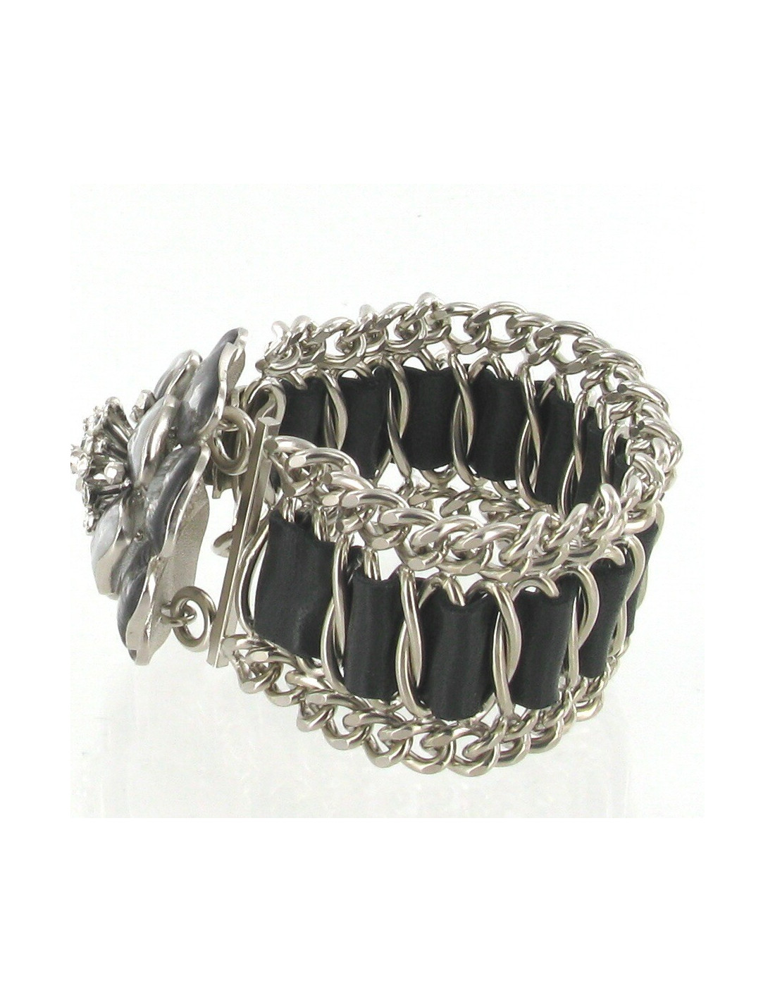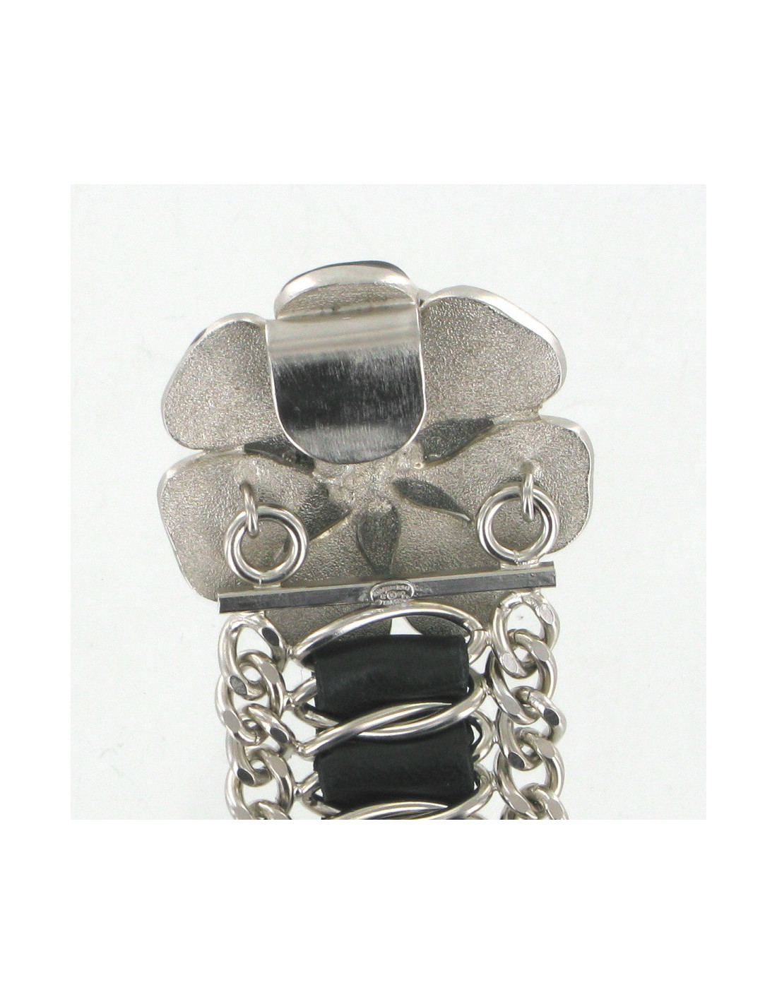 CHANEL Camélia bracelet glass paste, silver chain ring and black leather