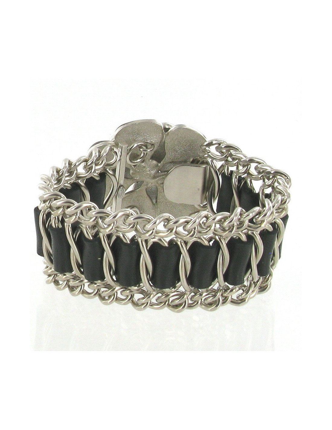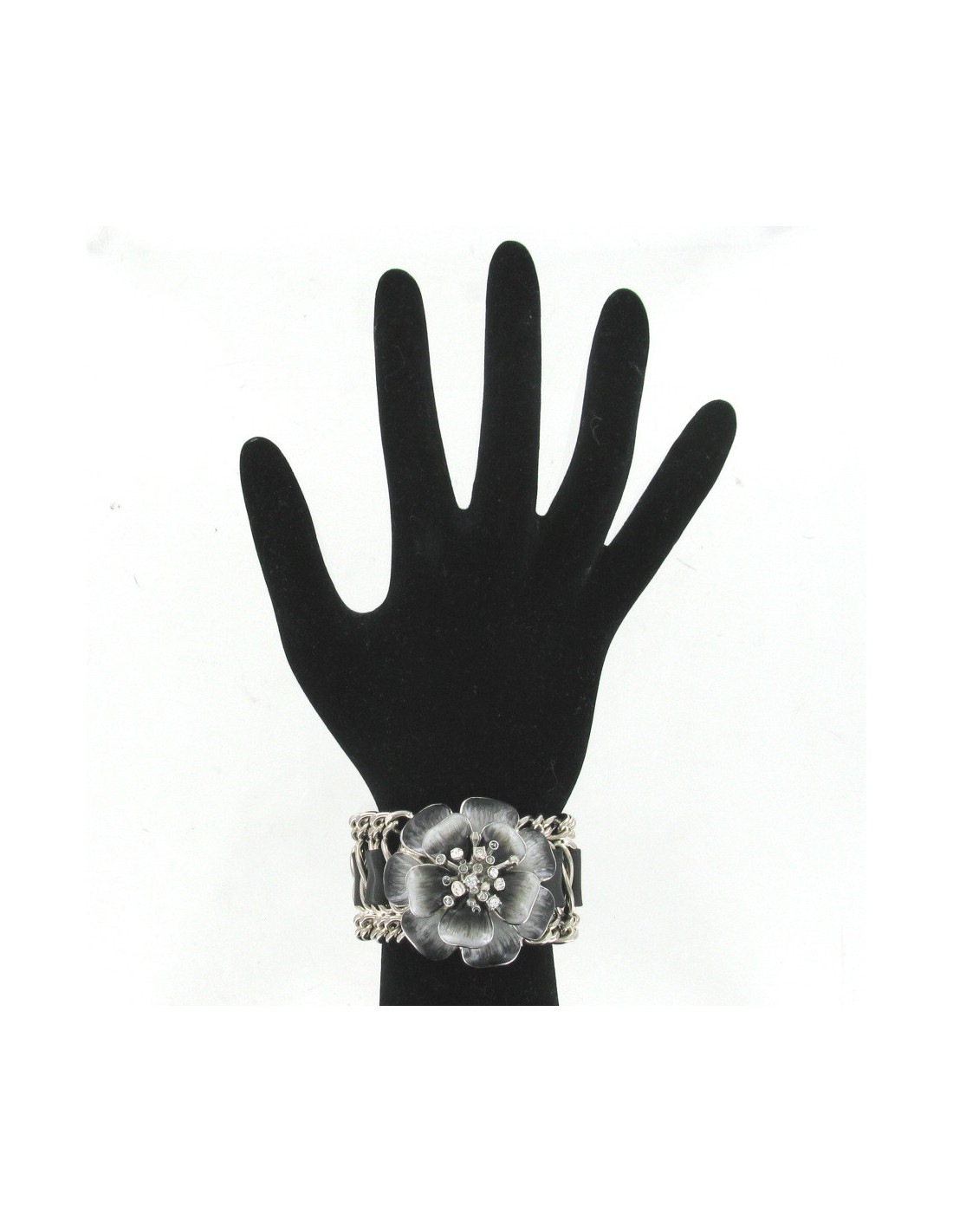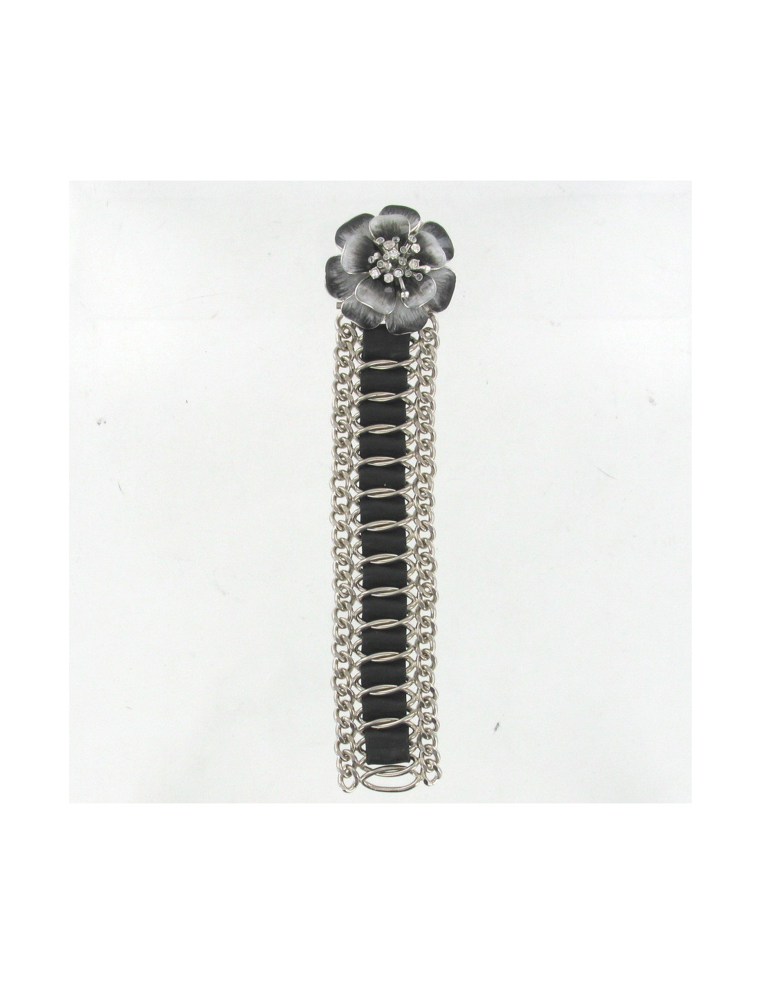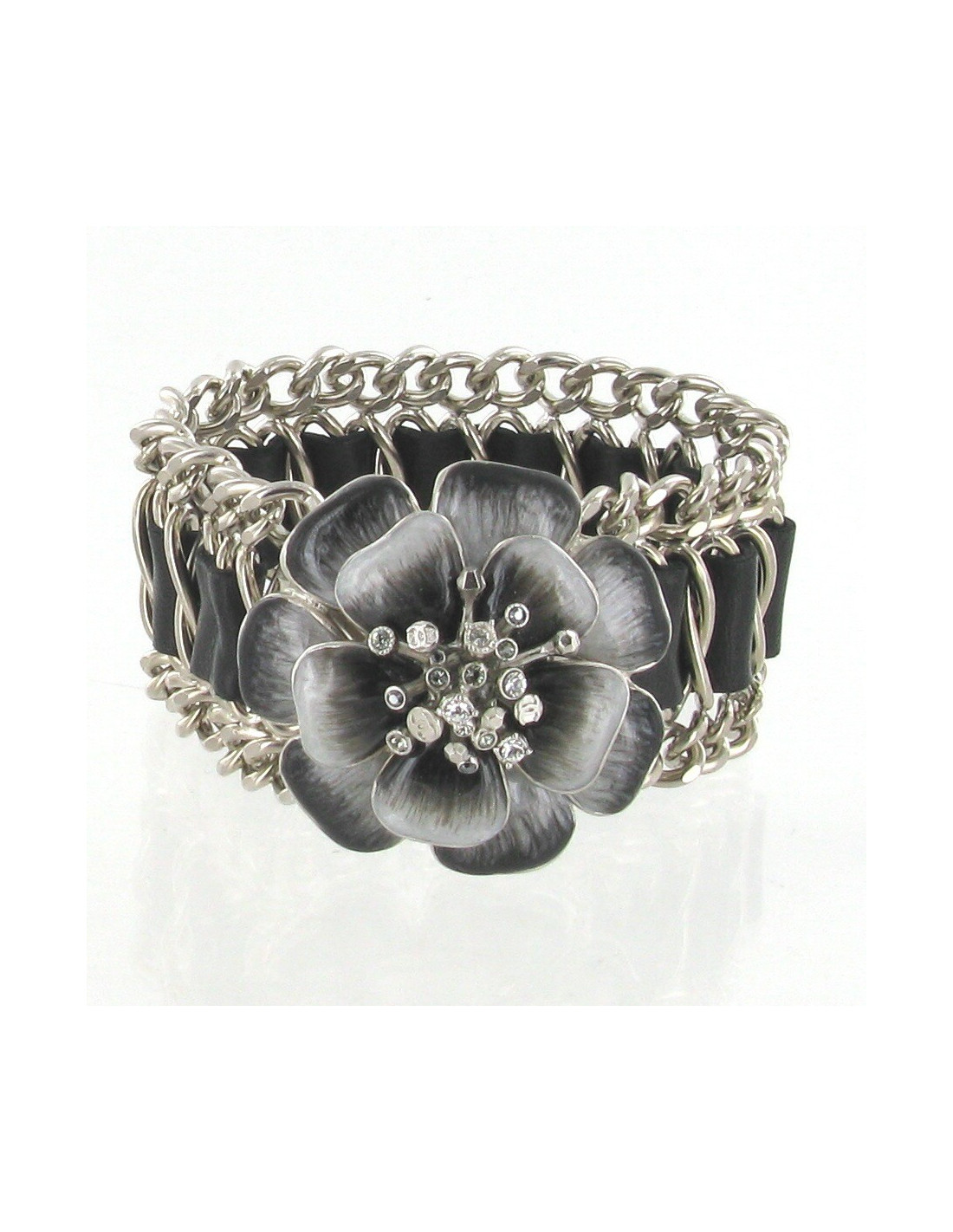 CHANEL Camélia bracelet glass paste, silver chain ring and black leather