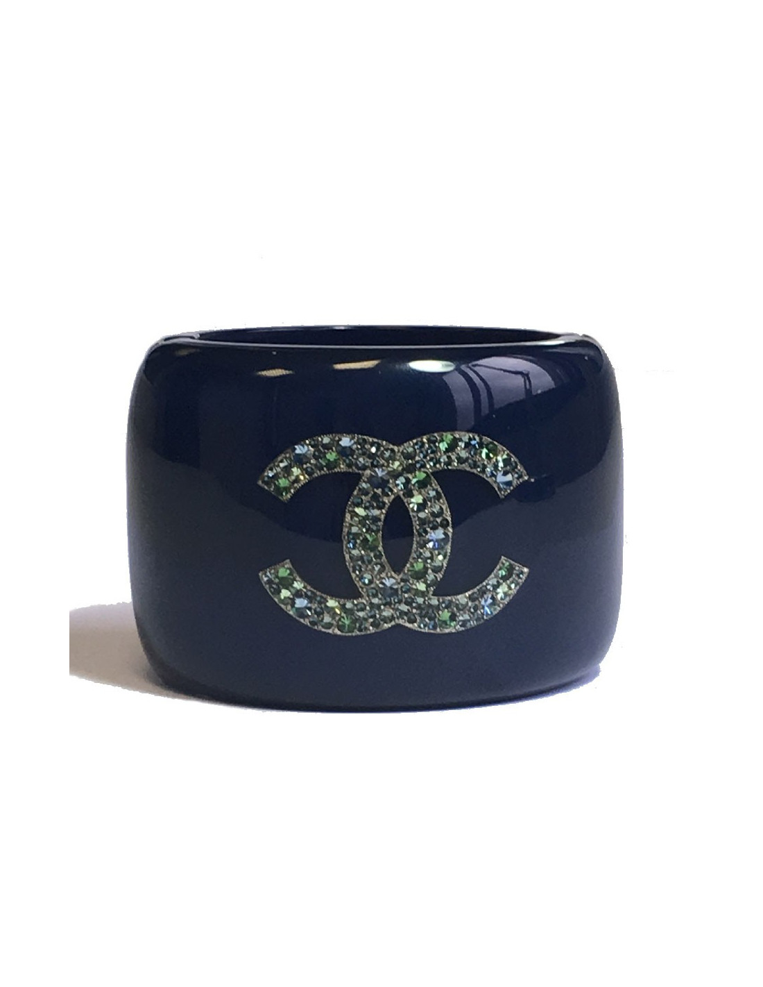 Beautiful Chanel cuff in blue lacquered resin. CC and star set with an inclusion of green, blue and white rhinestones.