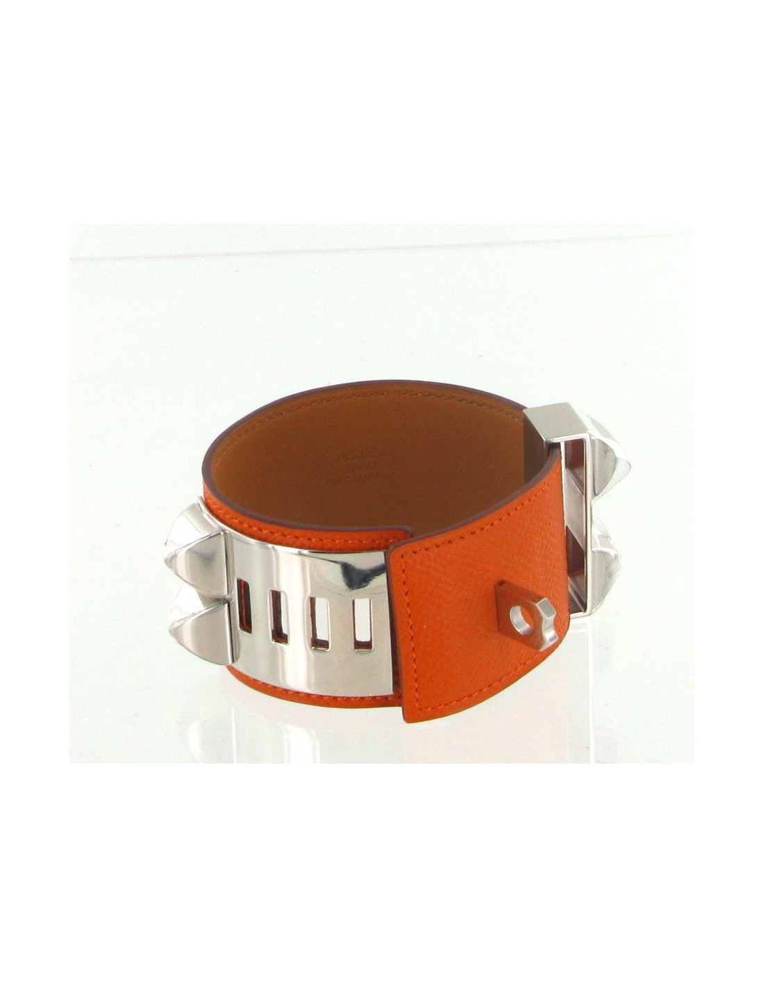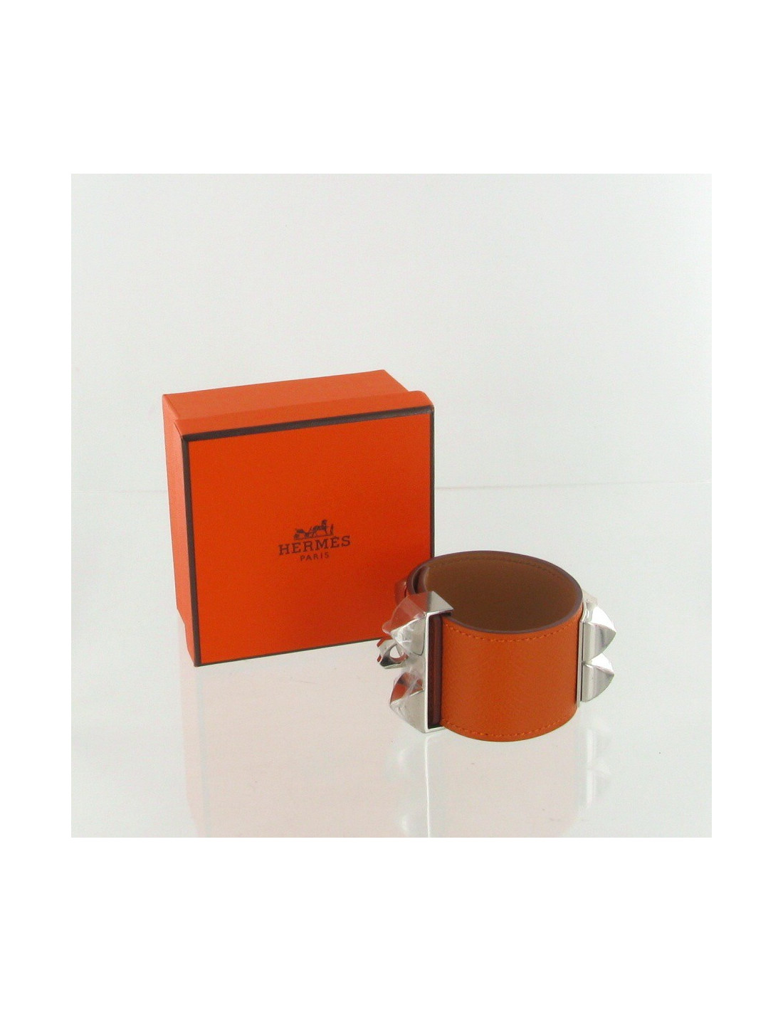 Cufflinks "Dog collar" HERMES leather orange epsom, silver plated clasp and Palladium. This headline has ever been brought. Three stops possible to close (one size). Letter P. book with its box, its pochon of origin, its tape, his package and the invoice.