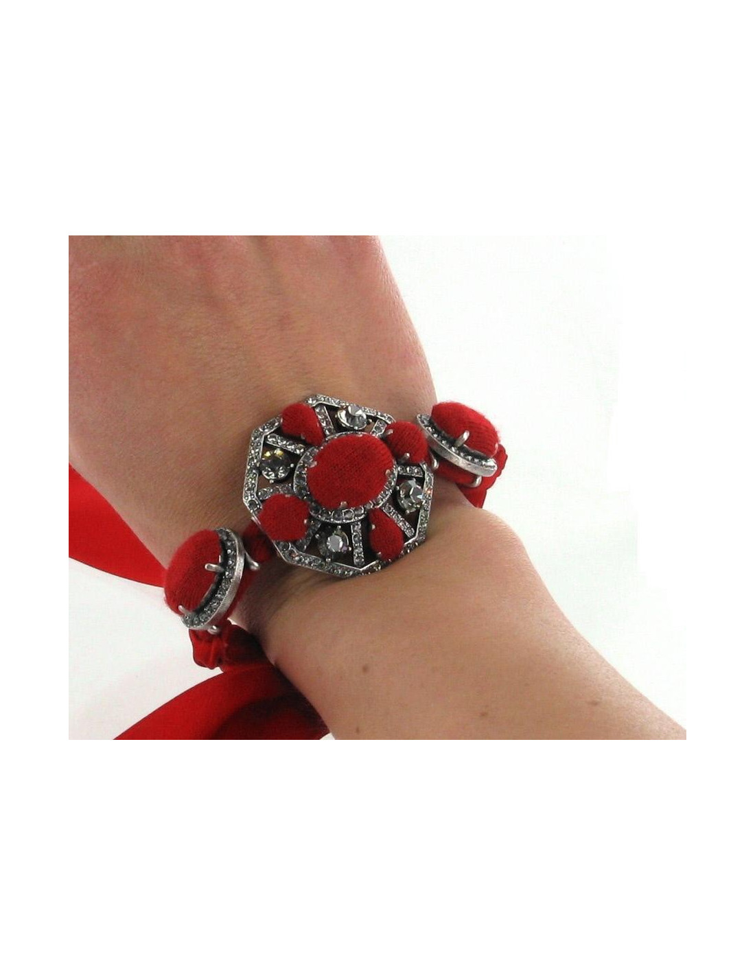 This LANVIN bracelet is decorated with 3 jewelry in downtown Silver set with Rhinestones. This bracelet interweaves Red satin, red fabric and the 3 Central bojoux. Fits any wrist widths since the clasp is a Red satin ribbon which is bound. Comes in its original box and its pochon of origin.
