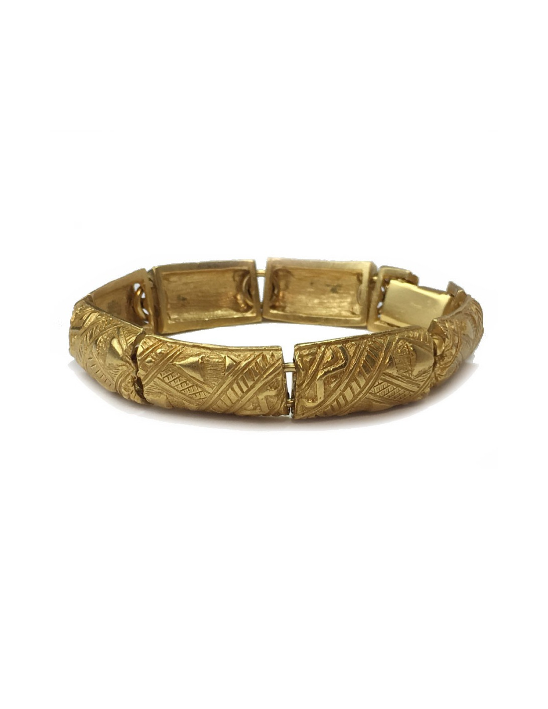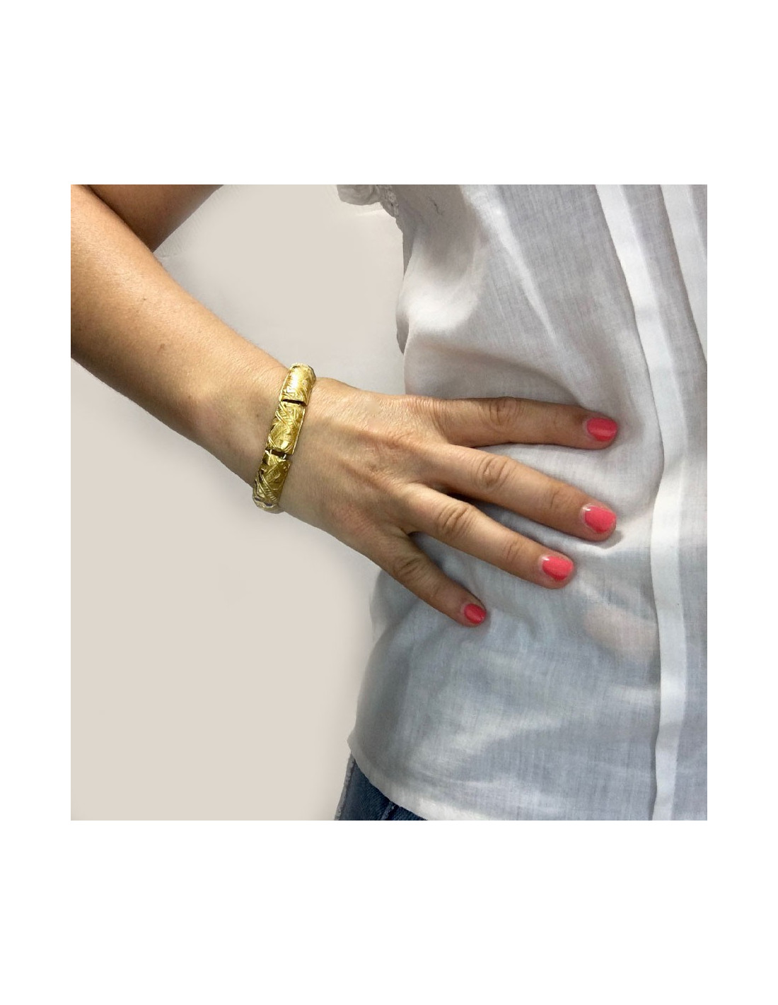 Yves Saint Laurent rigid bracelet in gilded metal, ethnic motif. Superb vintage object.