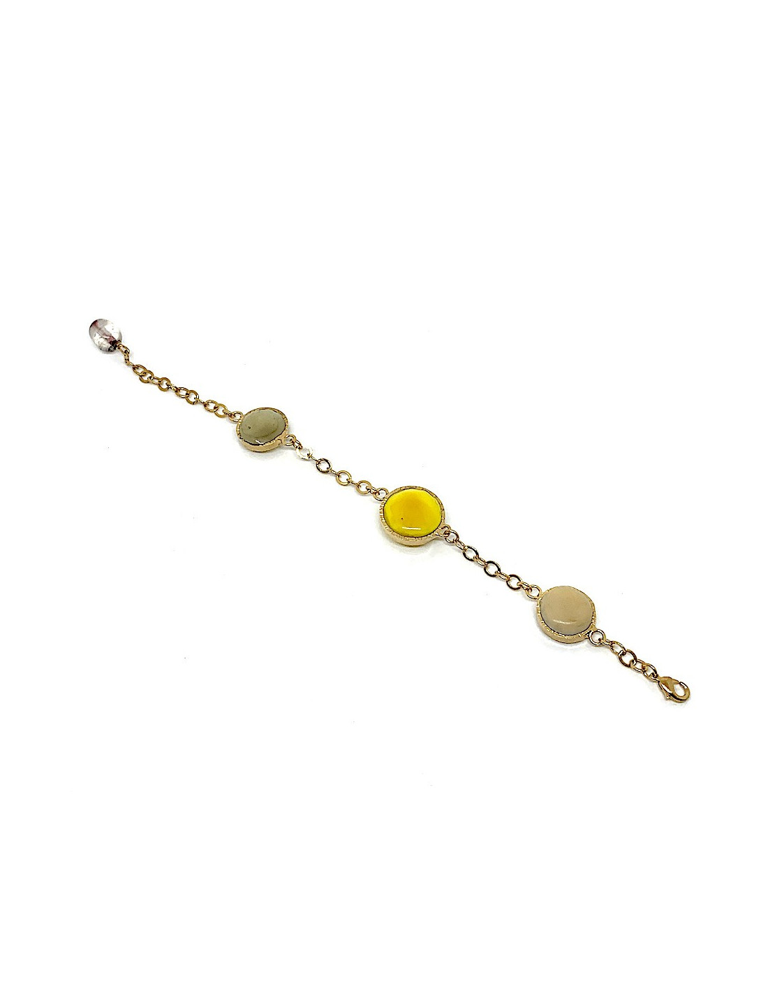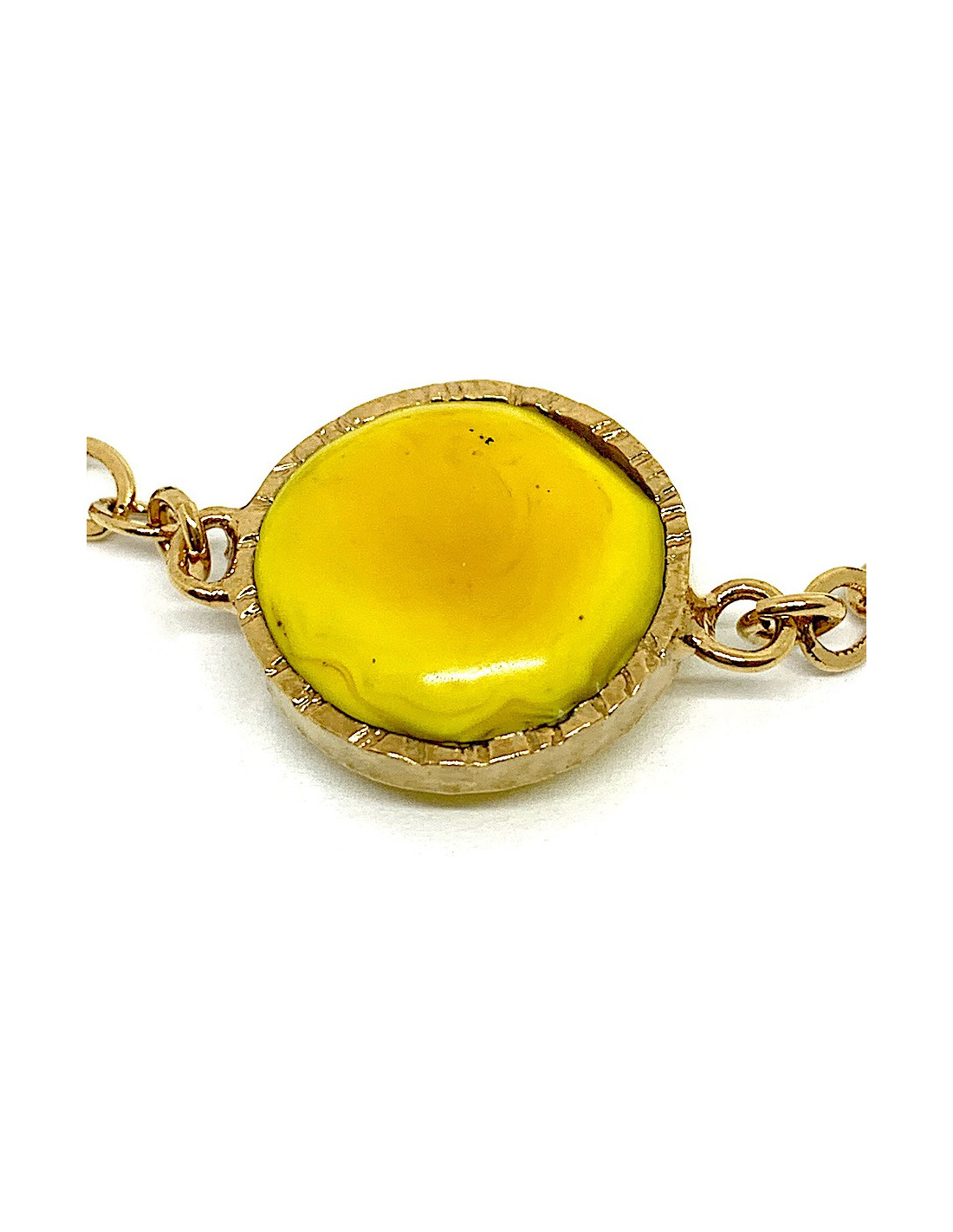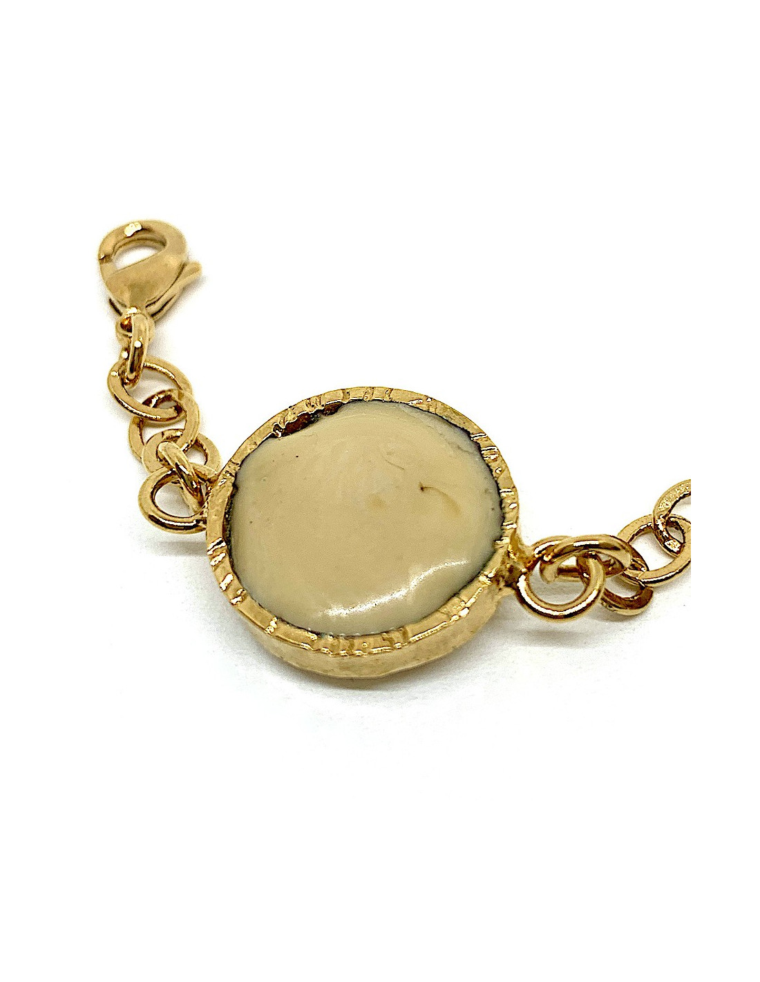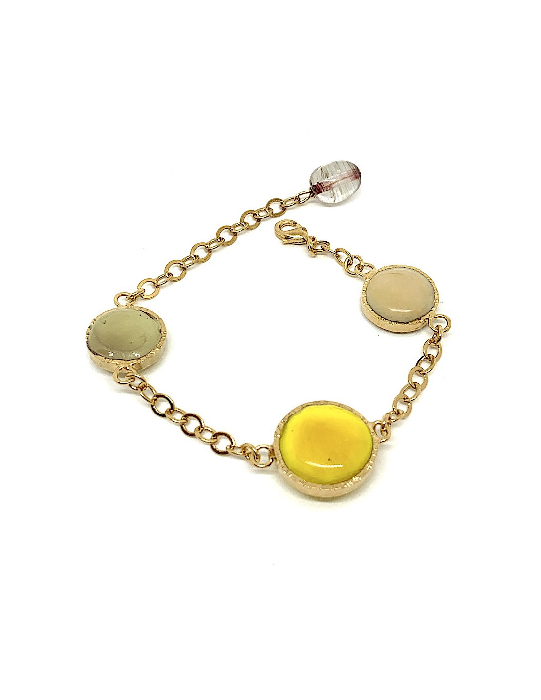 Unique piece by Maison MARGUERITE DE VALOIS, cabochon bracelet in molten glass in shades of yellow and beige, gold-plated metal chain.