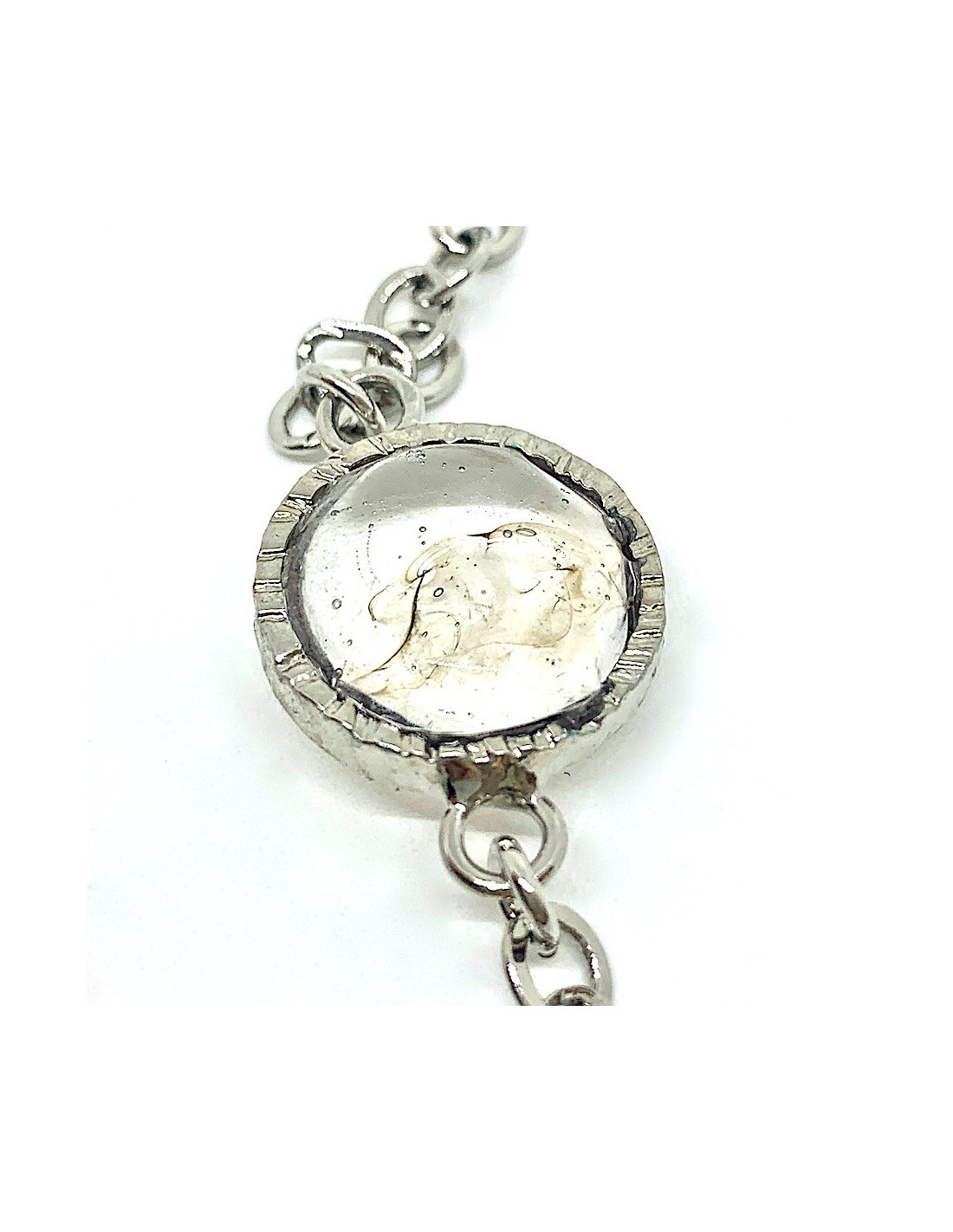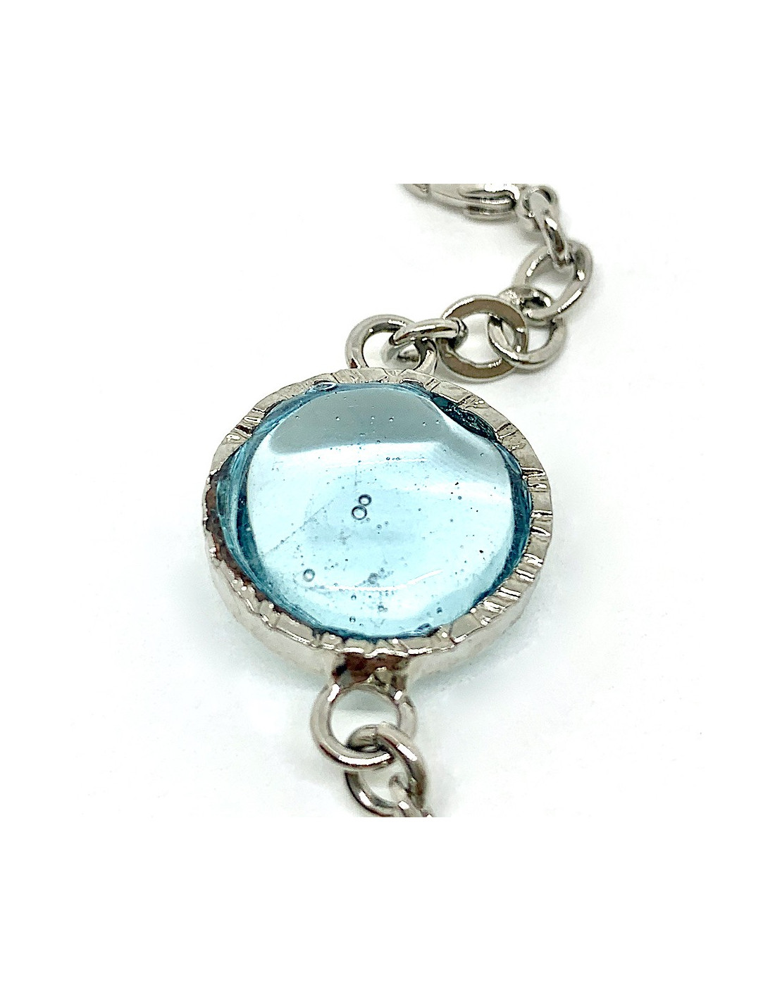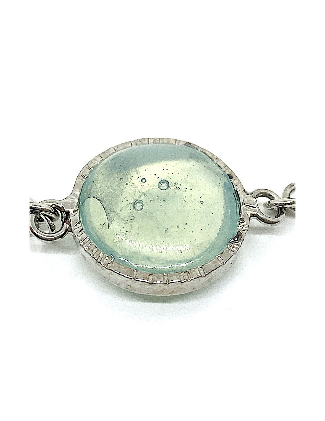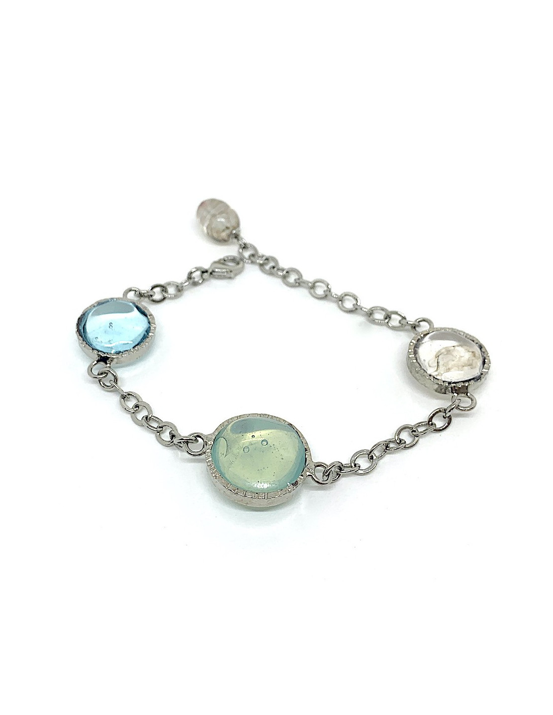 Silver-plated metal bracelet and molten glass cabochons in shades of transparent celadon, transparent sky blue and transparent.