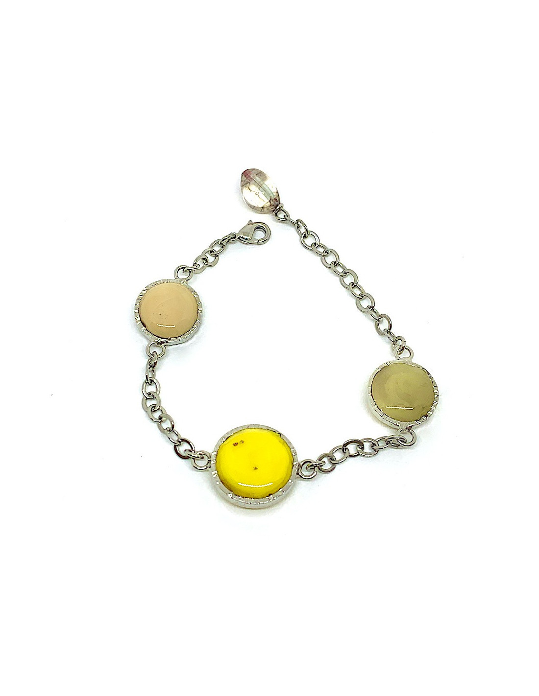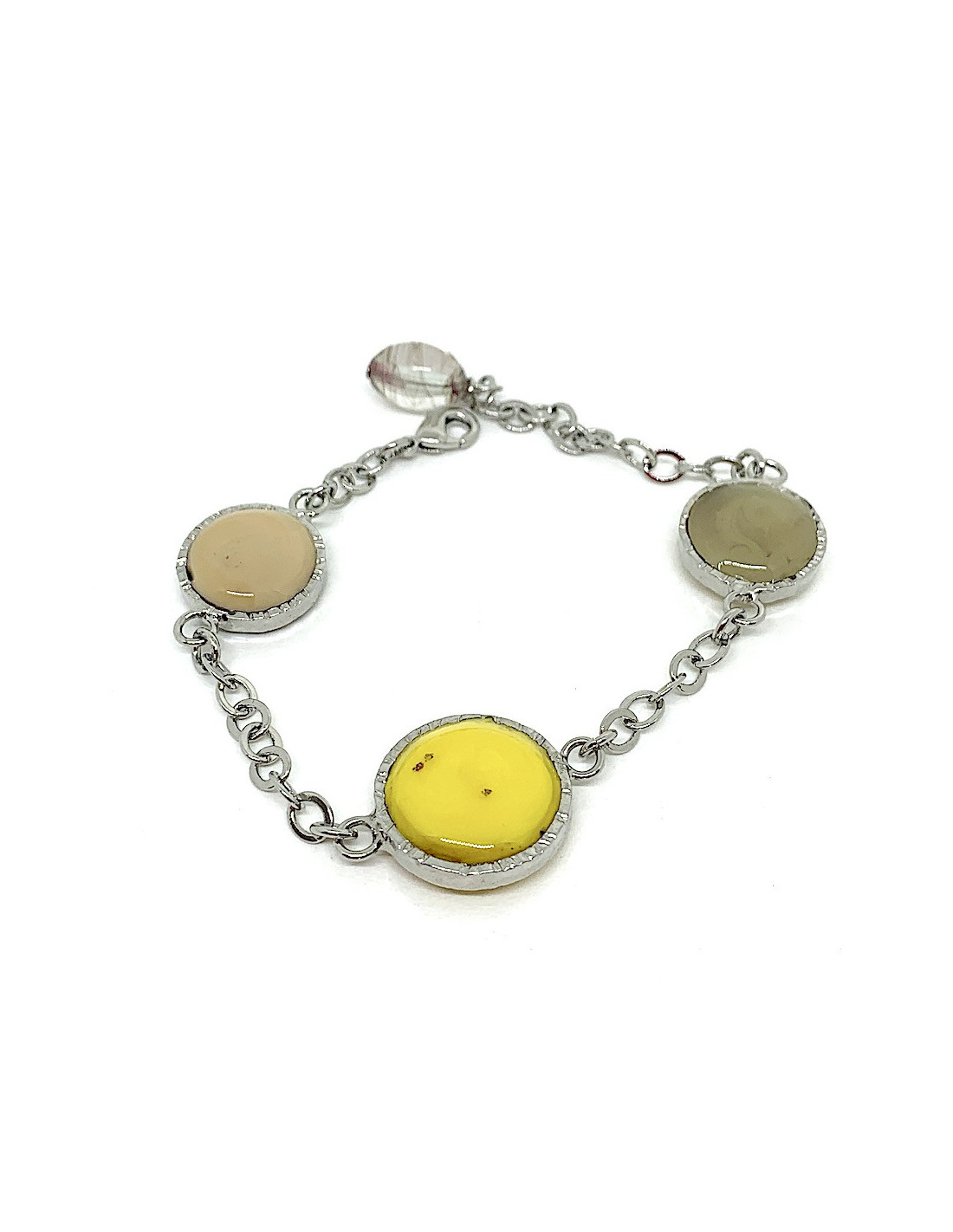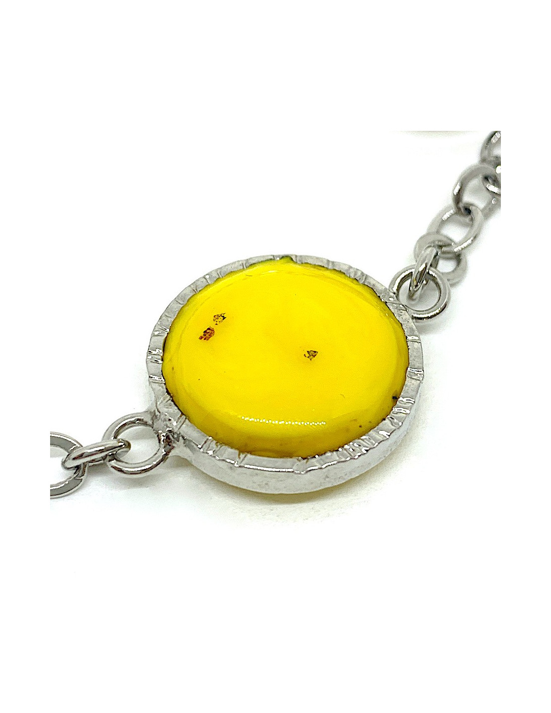 The bracelet is by Maison MARGUERITE DE VALOIS. Handcrafted by French jewelers, it comes in the form of a silver-plated metal chain with a round cabochon in amber-colored molten glass. Elegance made simple!