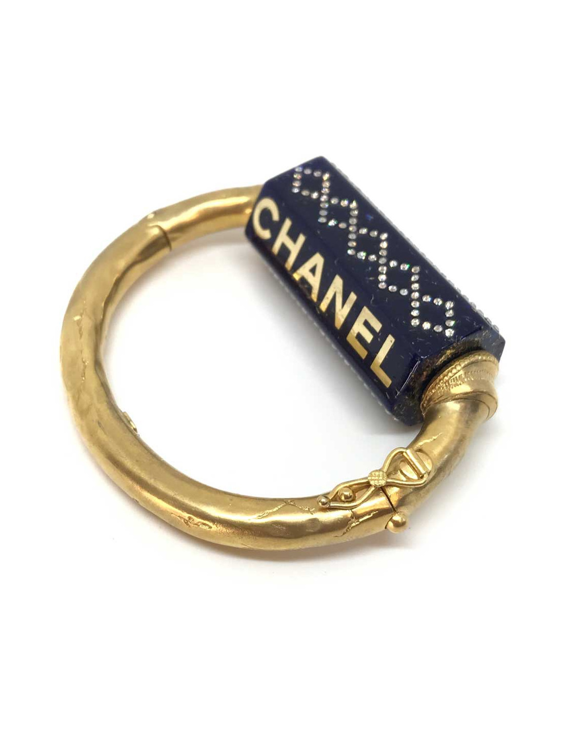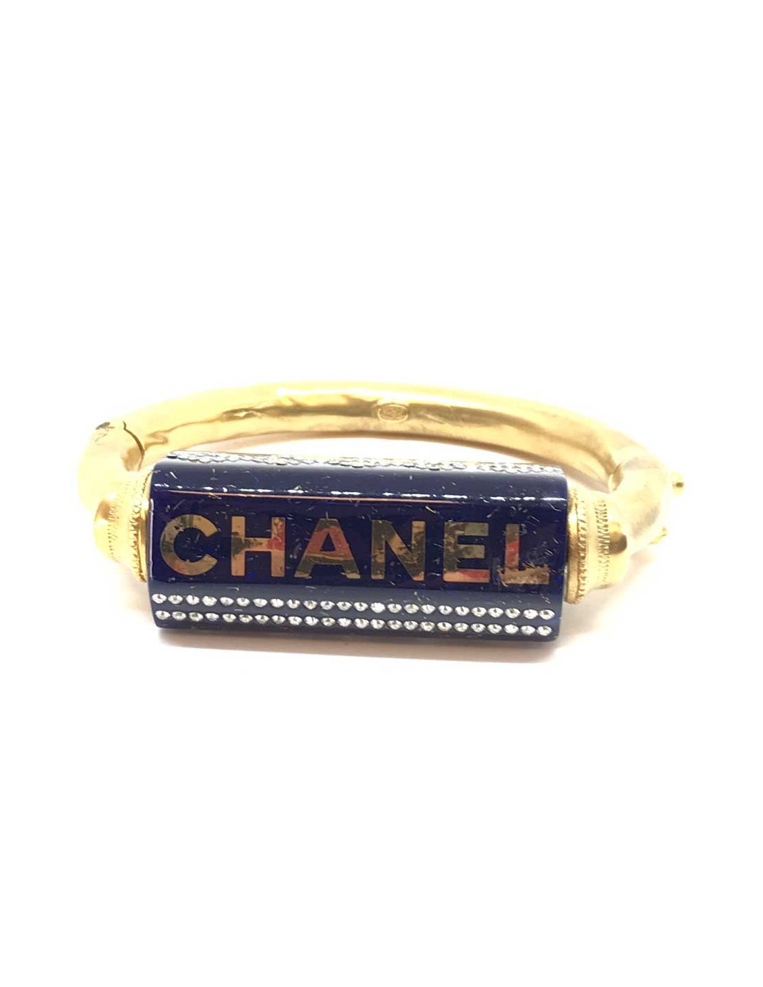 The bracelet is by Maison CHANEL. It features a thick, gold-gilded band with a blue resin tube, with gold-colored sparkles, and set with rhinestones.