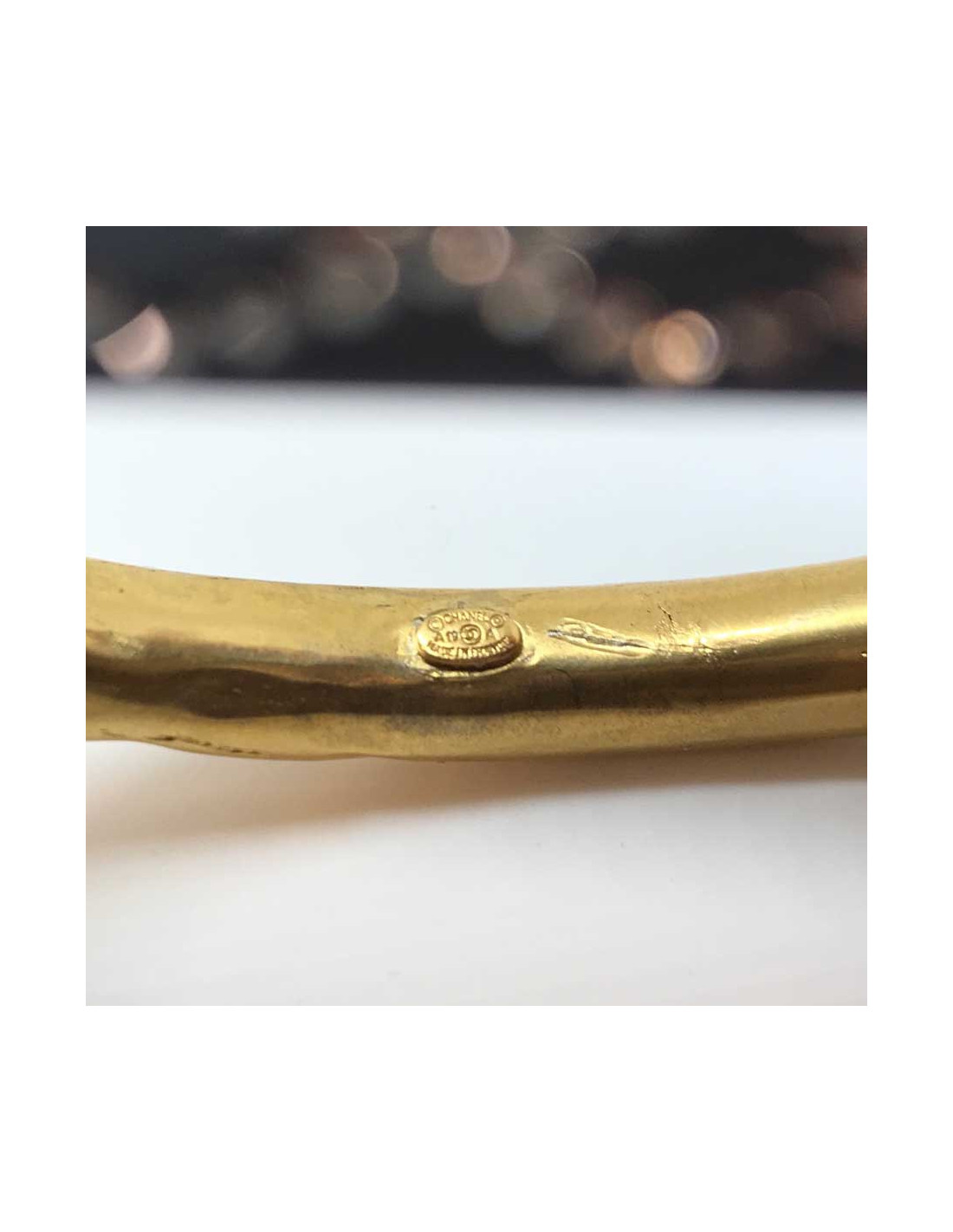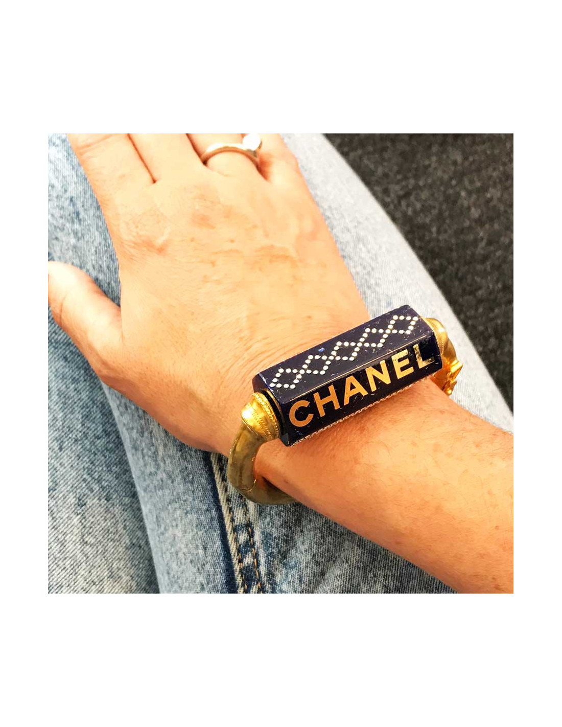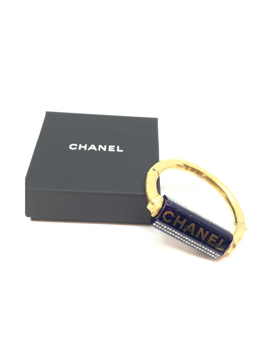 The bracelet has 2 sides on which the CHANEL logo can be read, and 2 sides paved with rhinestones. It is in very good condition, with a slight scratch at the L of chanel on the second side. It is from the Autumn-Winter 2019 Collection, as indicated by its stamp. It is Made In France. It has a handle circumference of 18 centimeters.