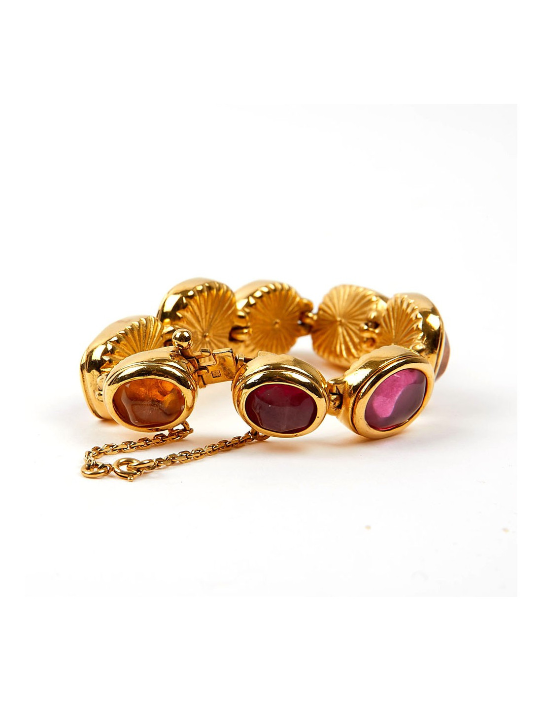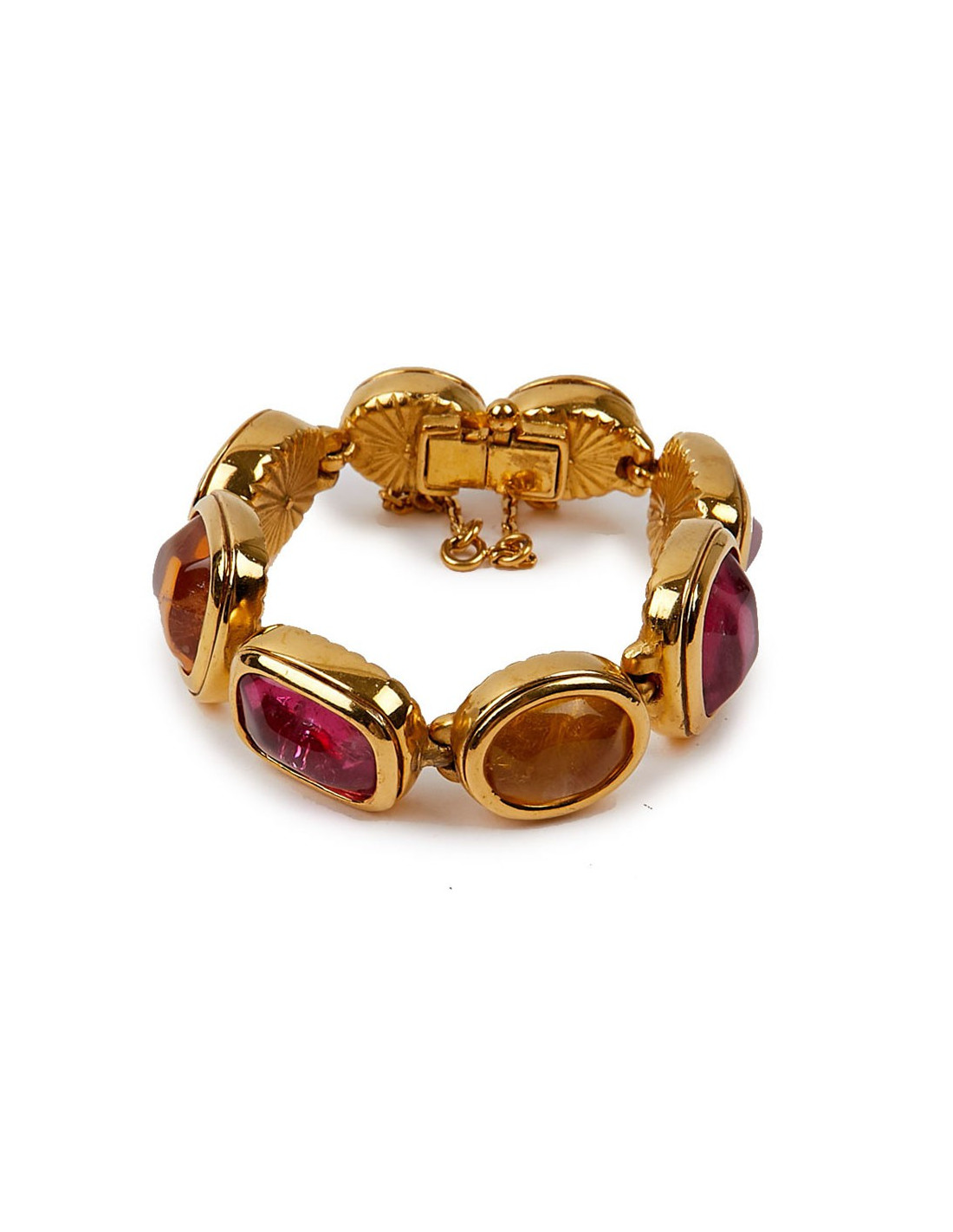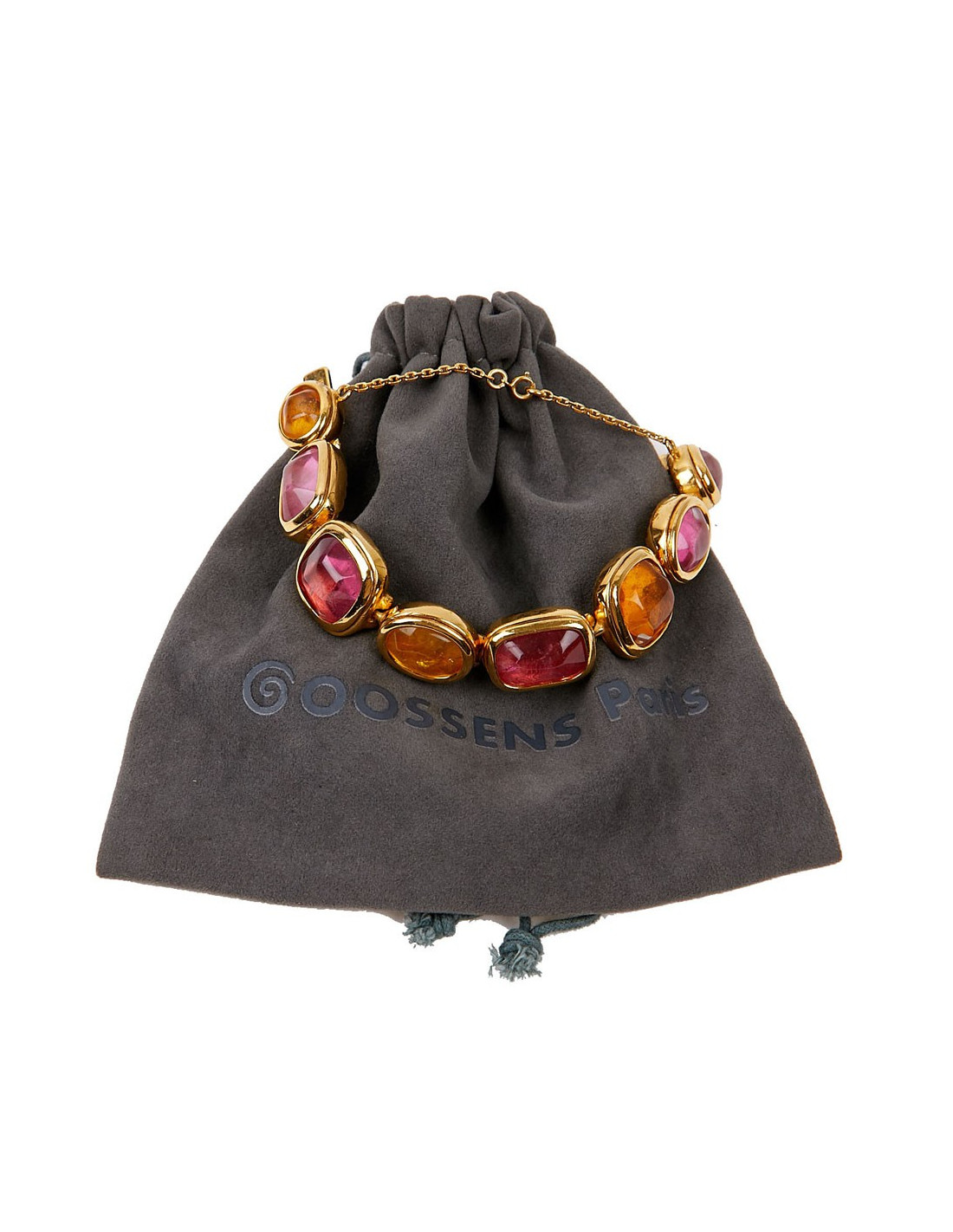 Last items in stock BRACELETS MARGUERITE de VALOIS red molten glass bracelet MARGUERITE DE VALOIS 14645 220.00 € MARGUERITE de VALOIS red molten glass bracelet Made in FranceCondition: very goodMaterials: molten glass, metalColors: ruby, orange, amethyst, fuchsia, goldHardware: gold plated metalMeasurements: length: 17cmDetails: Charming Marguerite de Valois bracelet in fine gold-plated metal, embellished with a series of ruby, orange, amethyst and fuchsia... Add to cart