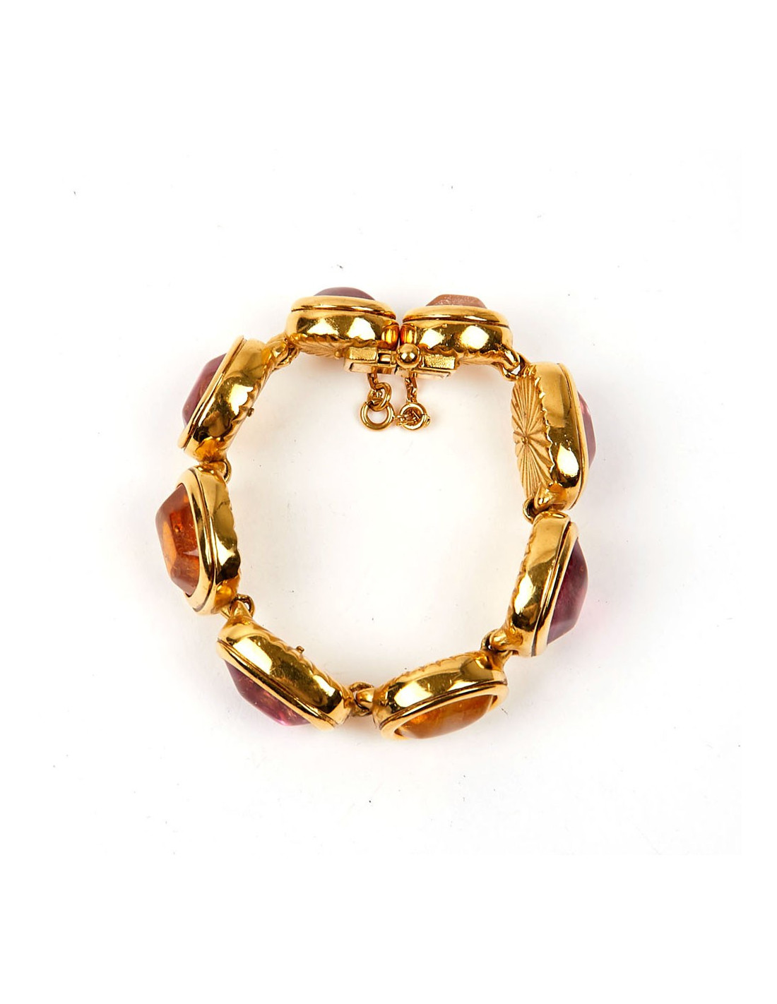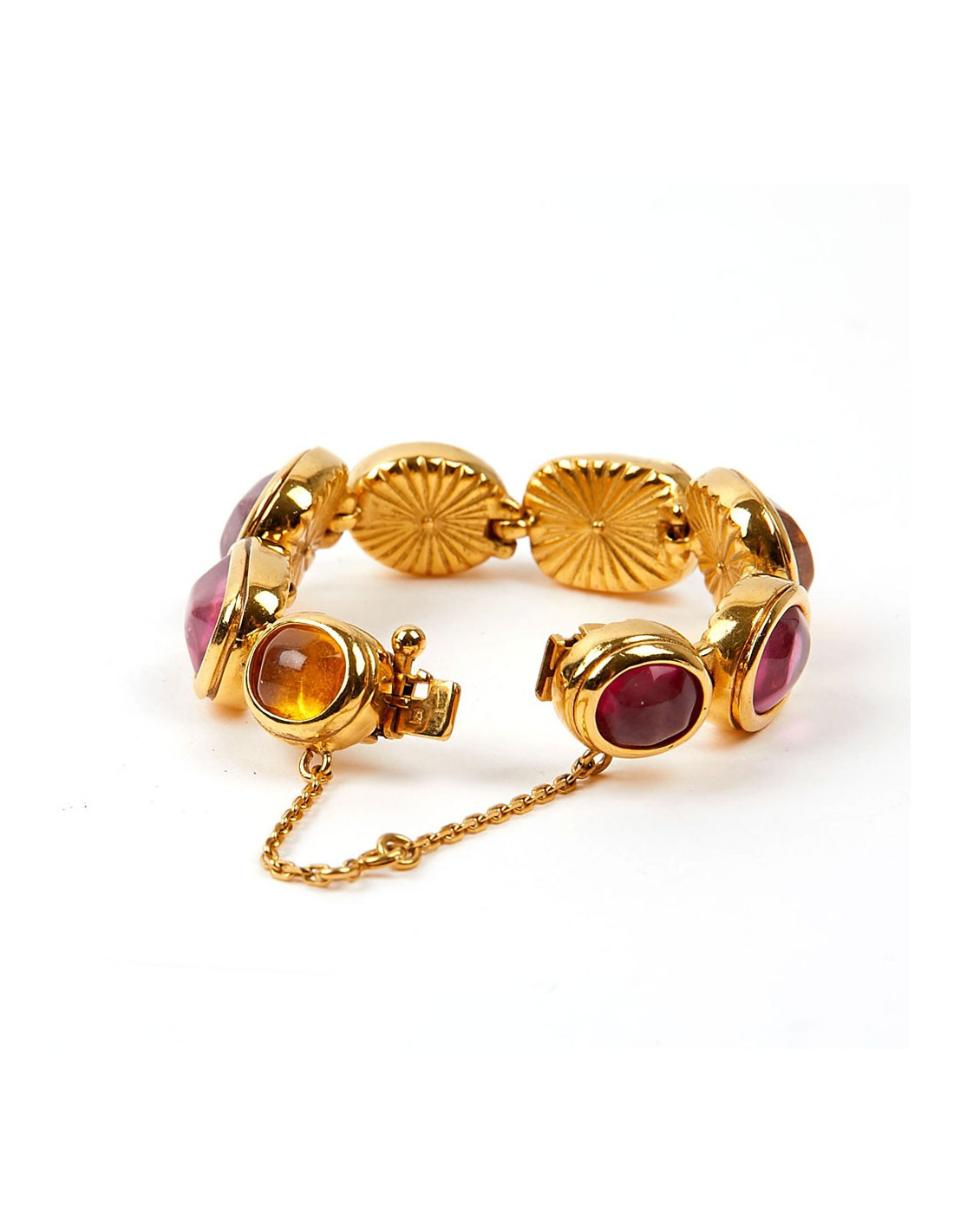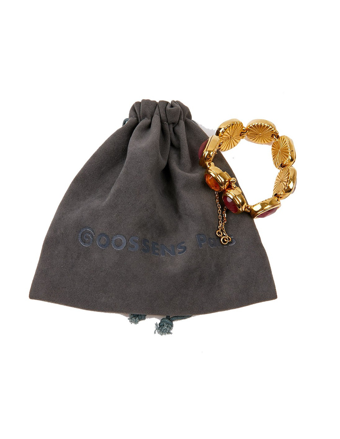 Last items in stock BRACELETS MARGUERITE de VALOIS red molten glass bracelet MARGUERITE DE VALOIS 14645 220.00 € MARGUERITE de VALOIS red molten glass bracelet Made in FranceCondition: very goodMaterials: molten glass, metalColors: ruby, orange, amethyst, fuchsia, goldHardware: gold plated metalMeasurements: length: 17cmDetails: Charming Marguerite de Valois bracelet in fine gold-plated metal, embellished with a series of ruby, orange, amethyst and fuchsia... Add to cart