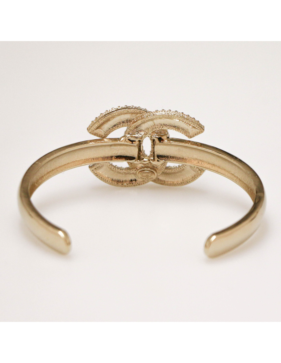 Last items in stock BRACELETS CHANEL Cruise collection gold cuff CHANEL 31315 1,250.00 € CHANEL Cruise collection gold cuff Condition : never wornMade in ItalyMaterial : metalColor: goldStamp : yesMeasurements : wrist circumference 18 cm, size M, height: 6 cm.Year : Cruise 2018 Advantage Valois Vintage Paris : comes in its CHANEL box Add to cart