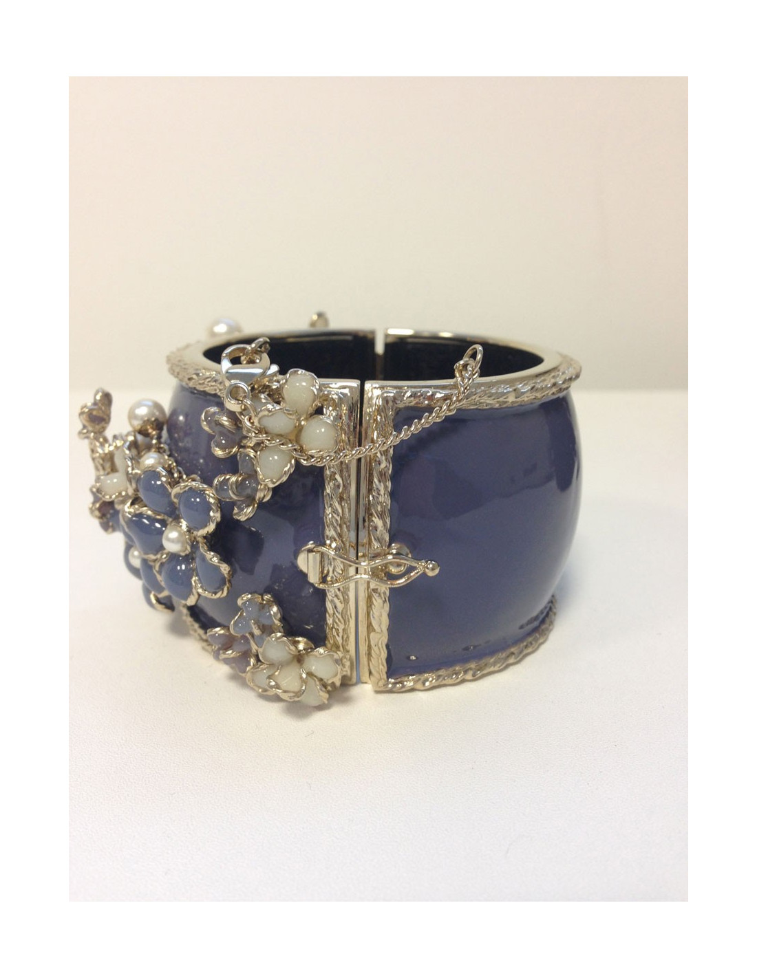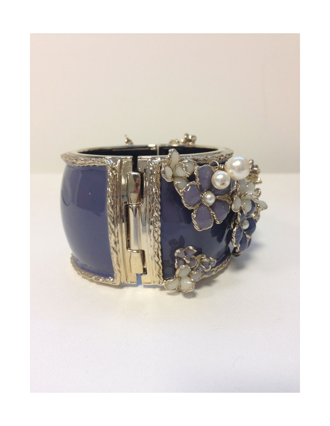 Chanel cuff fleurettes glass blue lavender, violet, white, heart in pearls. The bottom of the cuff is lavender blue resin mounted on metal Golden fine gold.