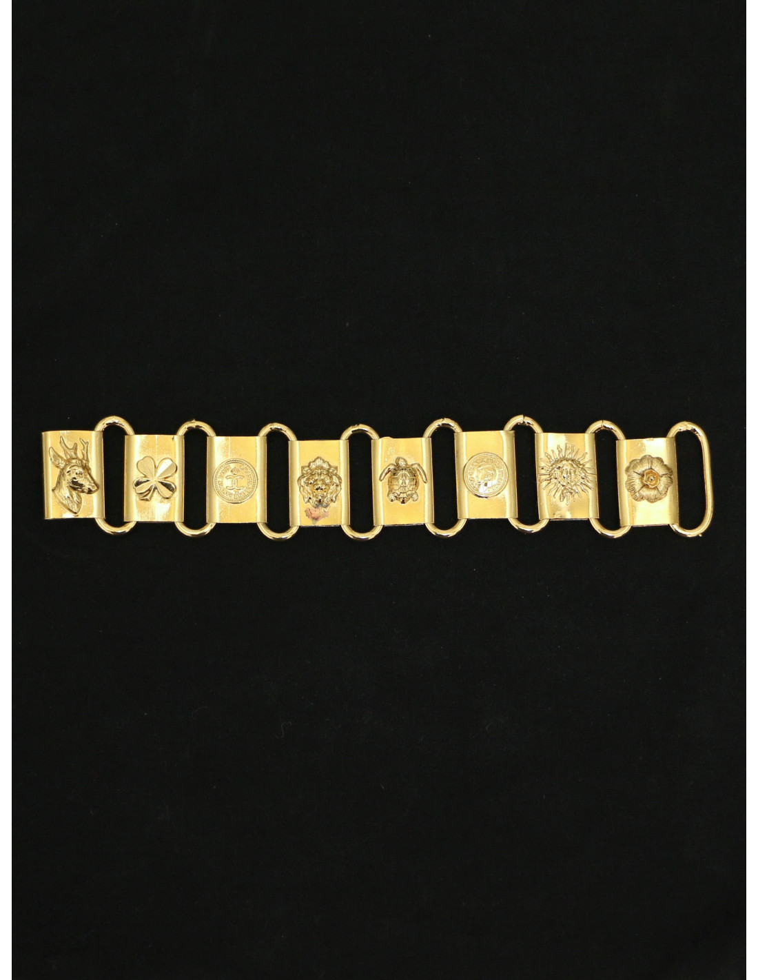 Last items in stock BRACELETS Unbranded leather and 18 k gold bracelet AUTRES MARQUES 16575 880.00 € Unbranded leather and 18 k gold bracelet Condition: good (the gold parts have patina)Matrials: leather, 18 carats goldColors: brown, goldMeasurements: length: 16cm, height: 1cmDetails: Lovely rigid bracelet in aged brown leather with beige saddle stitching. The corners are in solid 18-carat gold, set with 2 aged coins, in the spirit of Bulgari jewelry. It... Add to cart