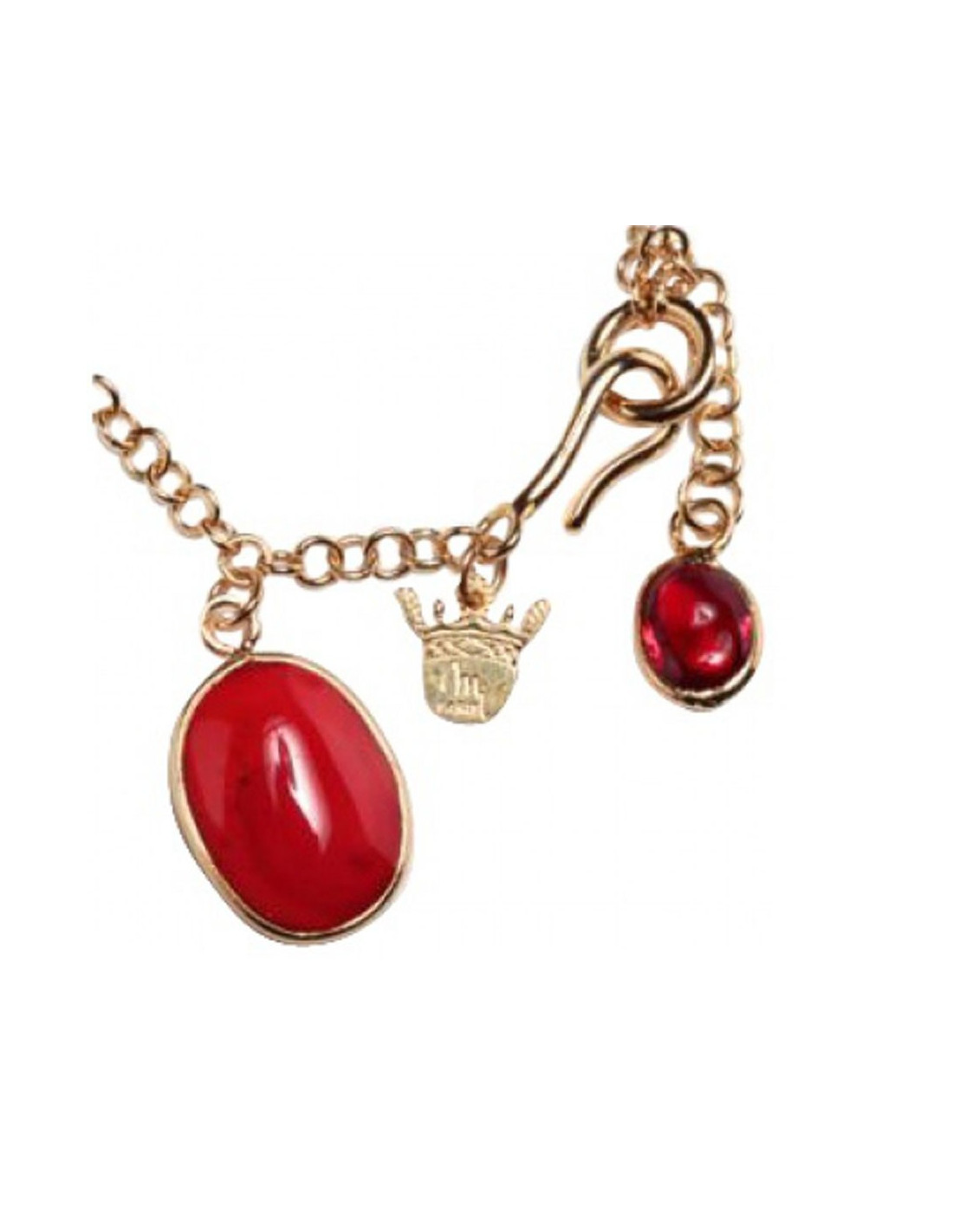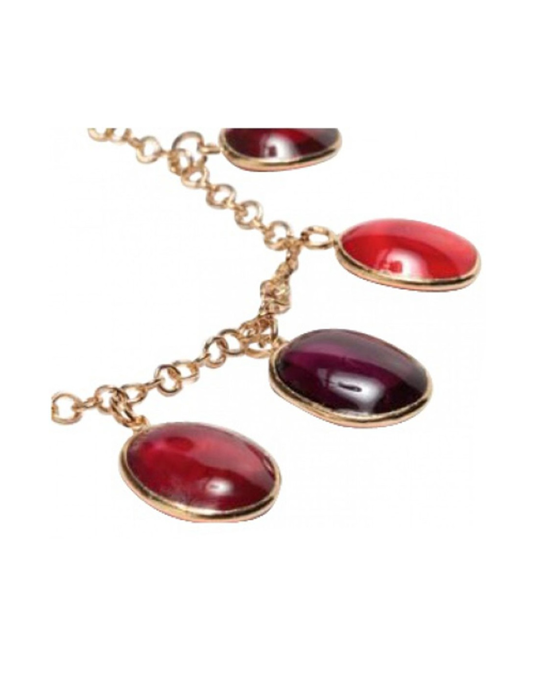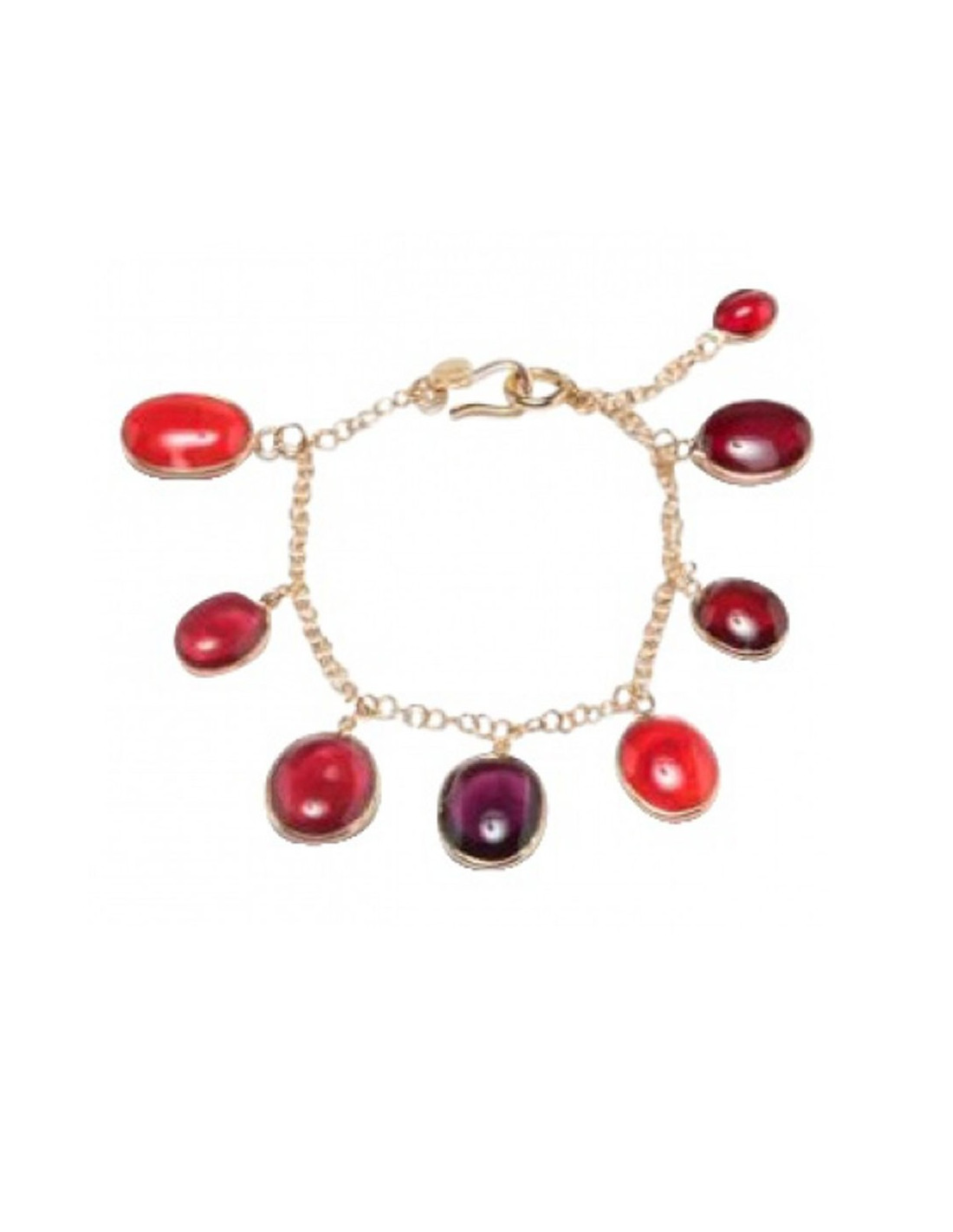 Details: Charming Marguerite de Valois bracelet in fine gold-plated metal, embellished with a series of ruby, orange, amethyst and fuchsia cabochons. Made in France, the jewels are crafted by Marguerite de Valois artisans who have worked for some 40 years for fashion giants such as Givenchy, YLS, Chanel and many others.