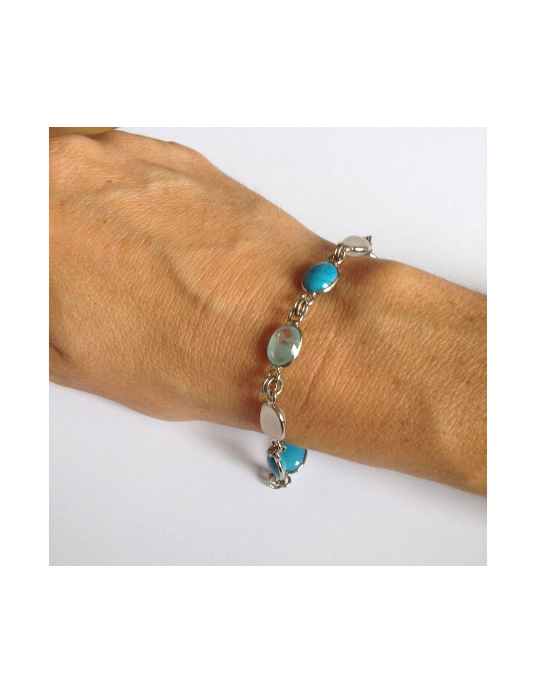 Marguerite de Valois bracelet in turquoise blue, transparent sky blue and transparent milky white molten glass cabochons, mounted on silver-plated metal.