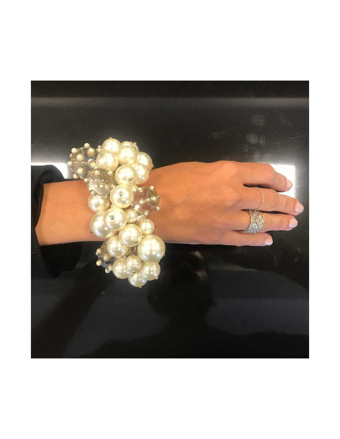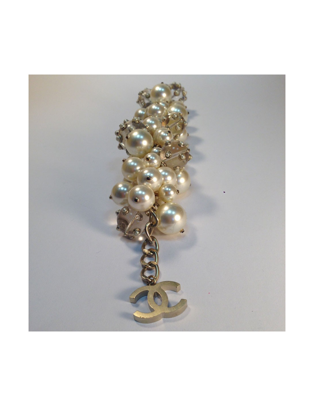 Beautiful and imposing bracelet large beads in Pearly Chanel and transparent beads inlaid small Pearly beads. In very good condition despite some small little visible marks on some pearls. Will be delivered in a beautiful package. Diameter of the large beads: 2.3 cm - diameter of the beads average 1.5 cm, diameter of the large transparent beads: 3 cm and medium transparent beads: 2 cm. The length of the bracelet: 28 cm. Chain silver ending with a big double C 3 cm x 2 cm.