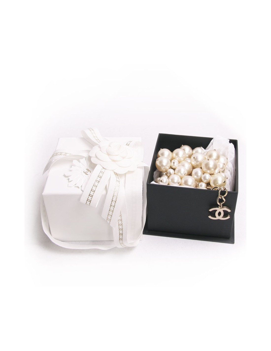 Beautiful and imposing large Pearly beads Chanel bracelet. In very good condition despite some small little visible marks on some pearls. The large pearls diameter: 2.3 cm - diameter of the beads average 1.5 cm. the length of the bracelet: 24 cm. String Golden ending with a big double C 3 cm x 2 cm.