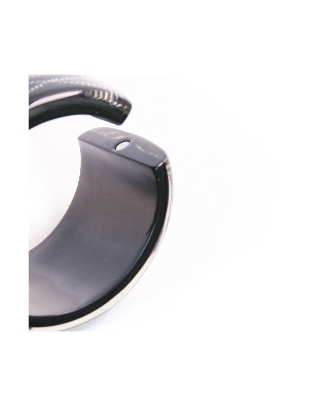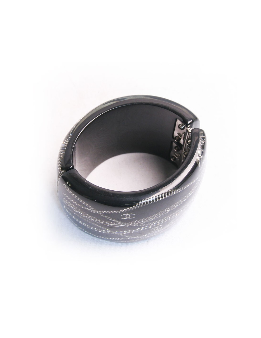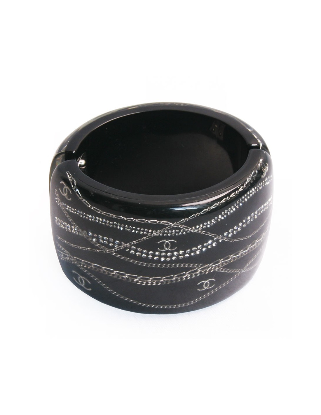 Very nice cuff Chanel enamelled black, with inclusions of double C, aged and rhinestone silver chains. It is closed by a magnet of security. The cuff has some micro-scratches. Good condition. diameter: 6.5 cm - height: 5.5 cm