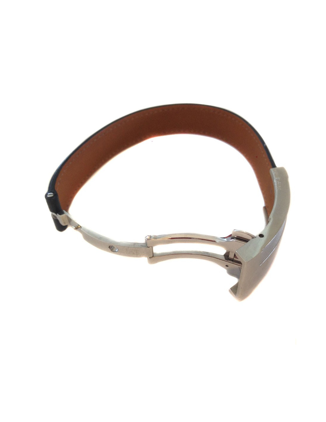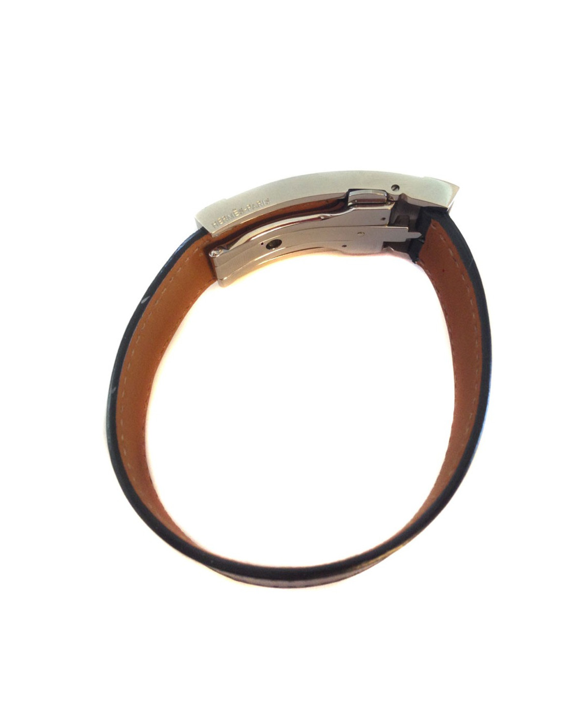 Hermes bracelet for man in black leather exterior and leather inner gold, the center of the metal ring bracelet represents a H, it is closed by a folding clasp. Some scratches on the clasp.