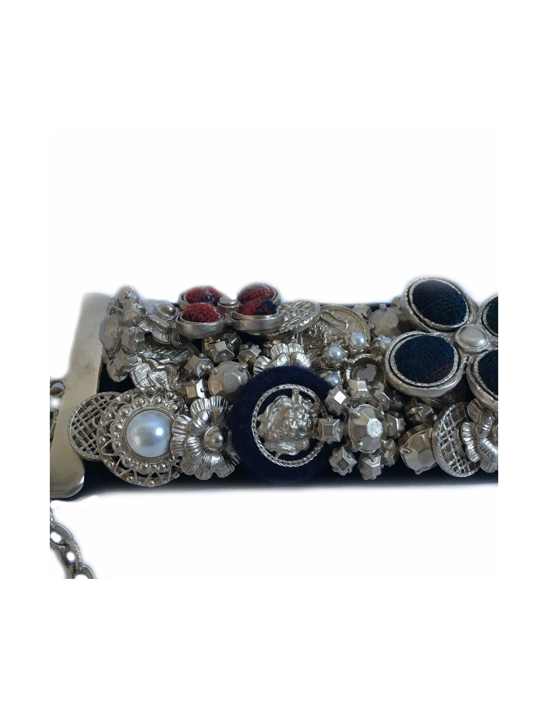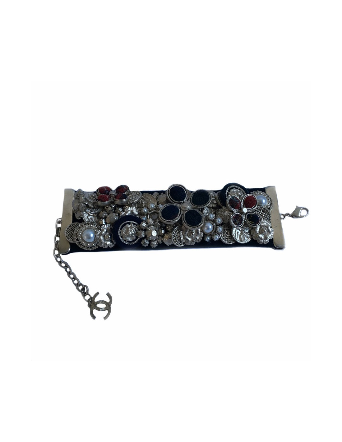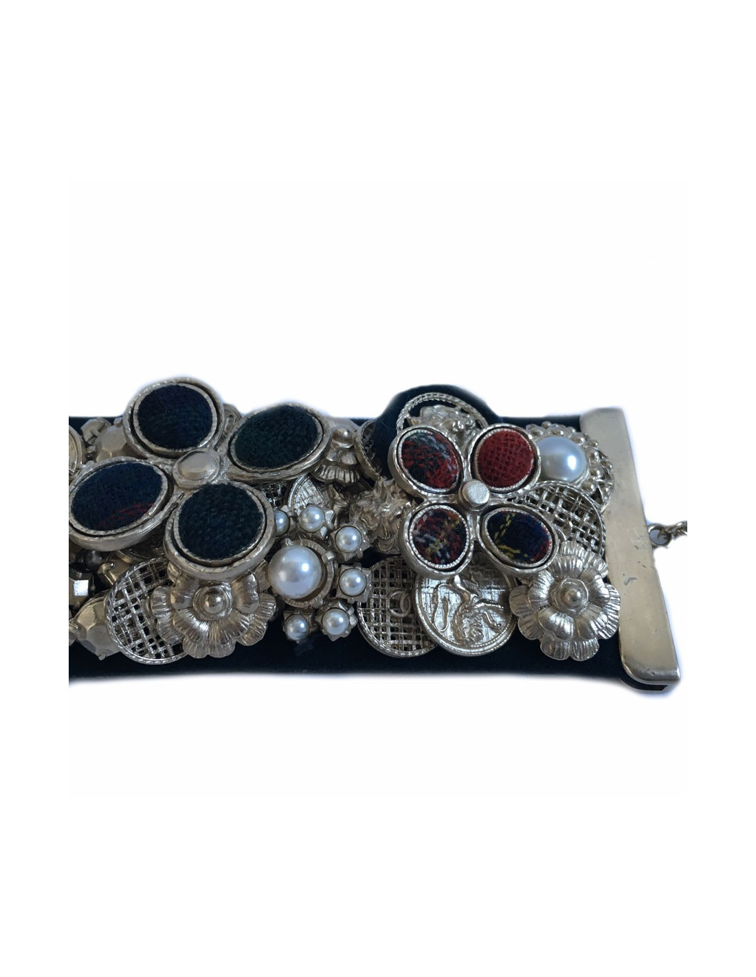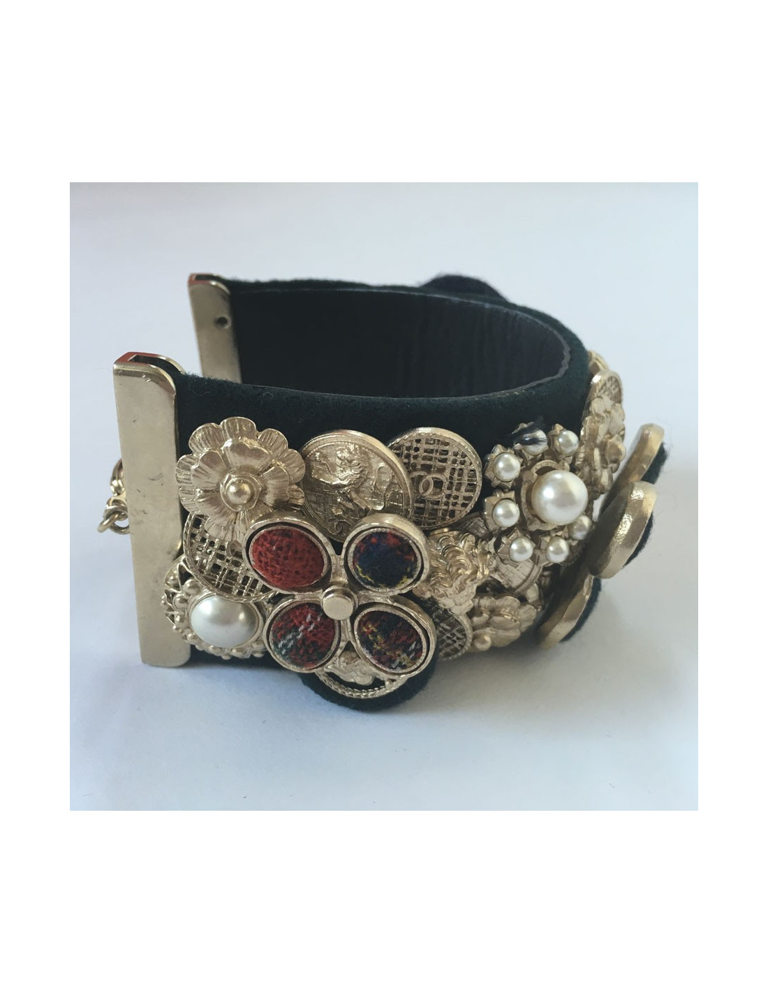 Splendid News CHANEL "Paris-Edinburgh" cruise collection. Cuff in leather and blue velvet failure marine. Panels of flowers, buttons, golden metal parts, covered with Pearly beads, Velvet the plaid failure. On a flower in the middle of the cuff is missing the Central Pearl.