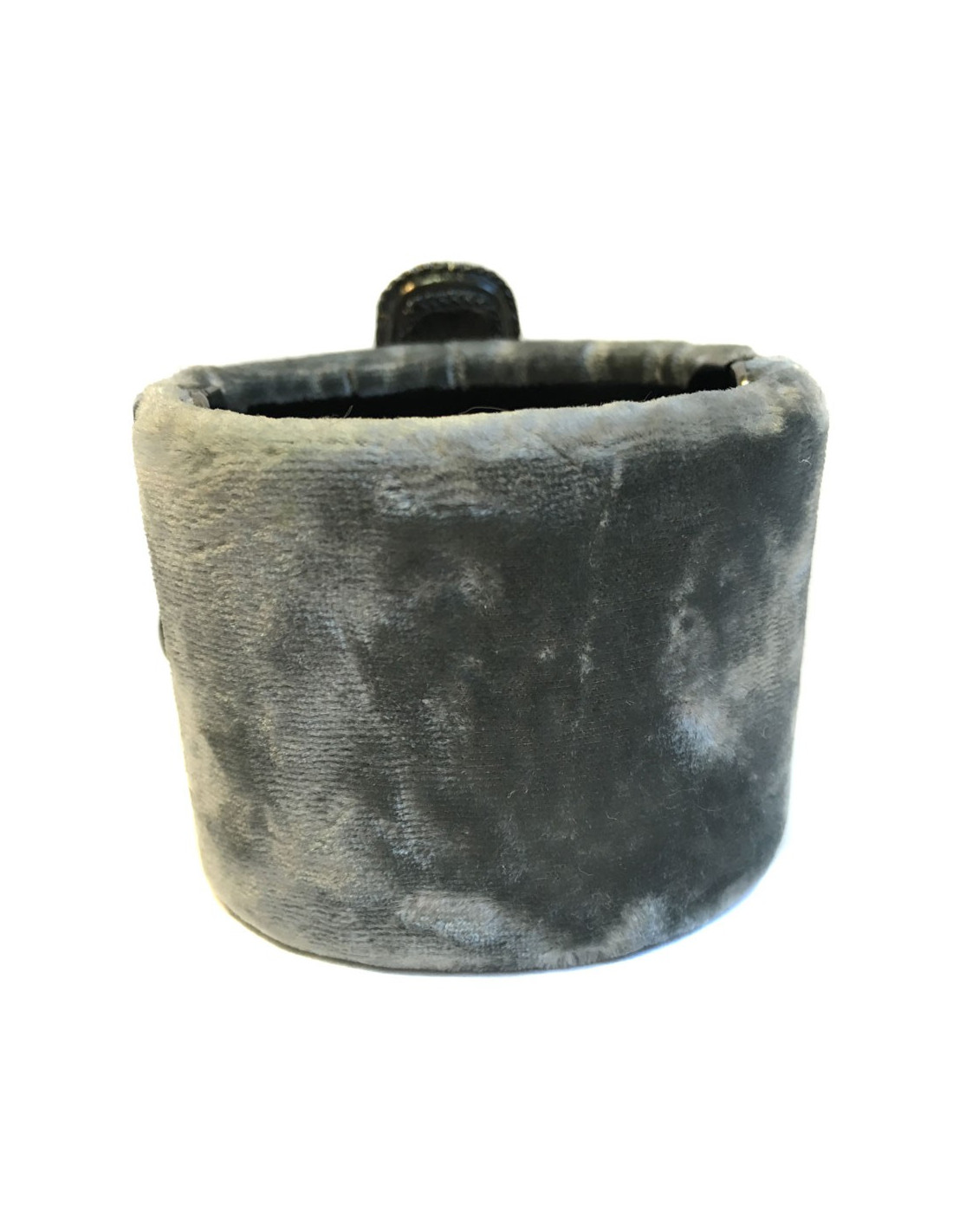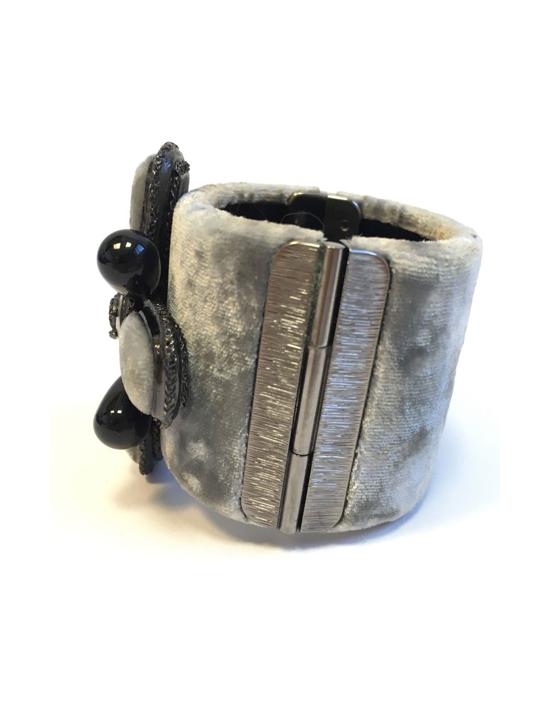 Beautiful CHANEL cuff down velvet gray and black glass paste. Cuff in ruthenium. The joint is brushed silver metal. A CC in braided ruthenium is located in the center of the bracelet affixed to a round piece silver metal. The clasp is a decorated slipper of a CC.