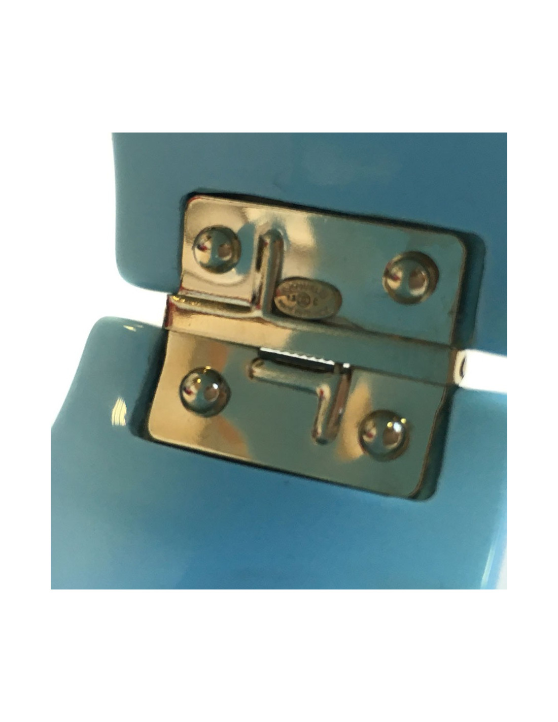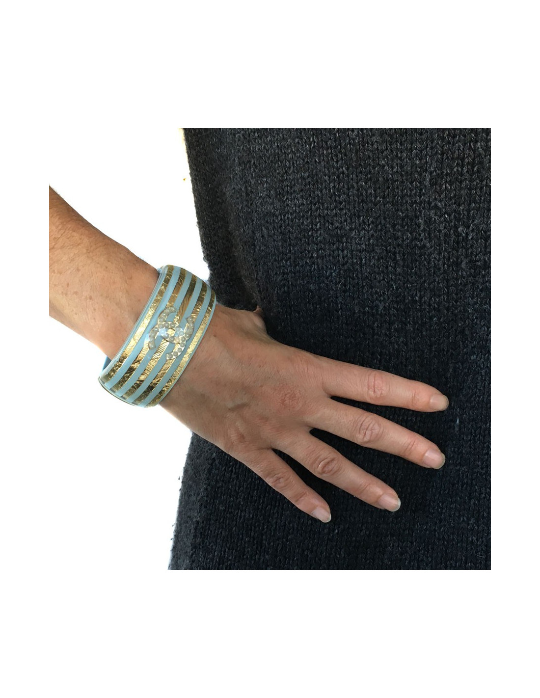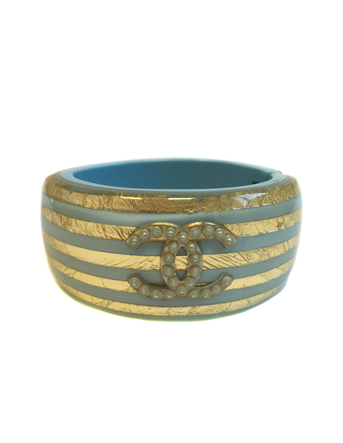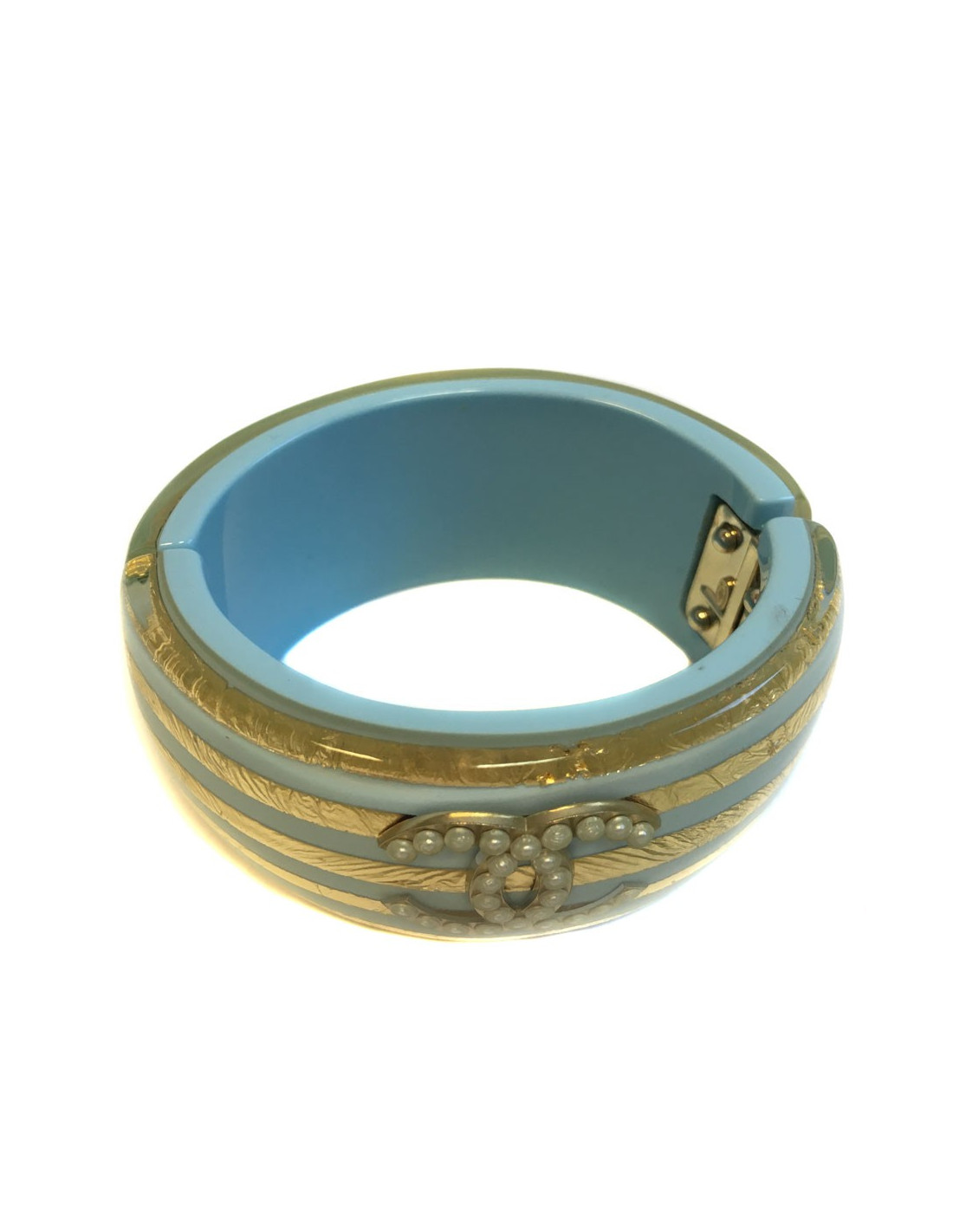 Superb collection cruise 2013 CHANEL cuff. Resin bracelet blue sky with an inlay of 5 strips of gold leaf. A small white pearls adorned CC is embossed on the cuff. Loving clasp. Thumbnail of brand presents.