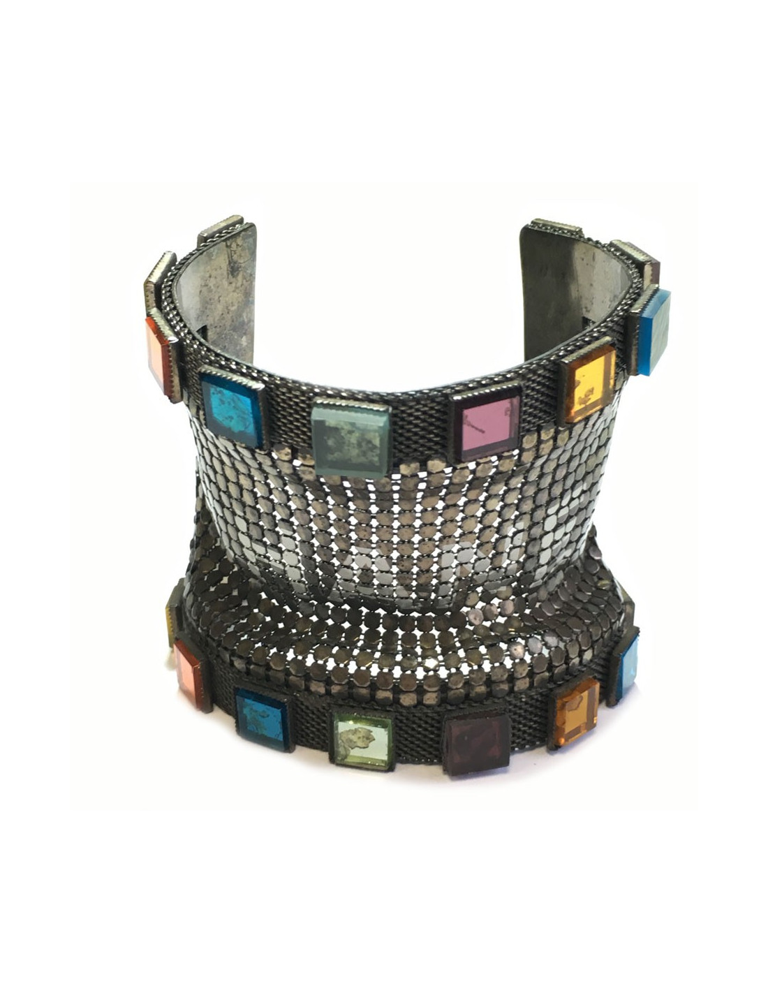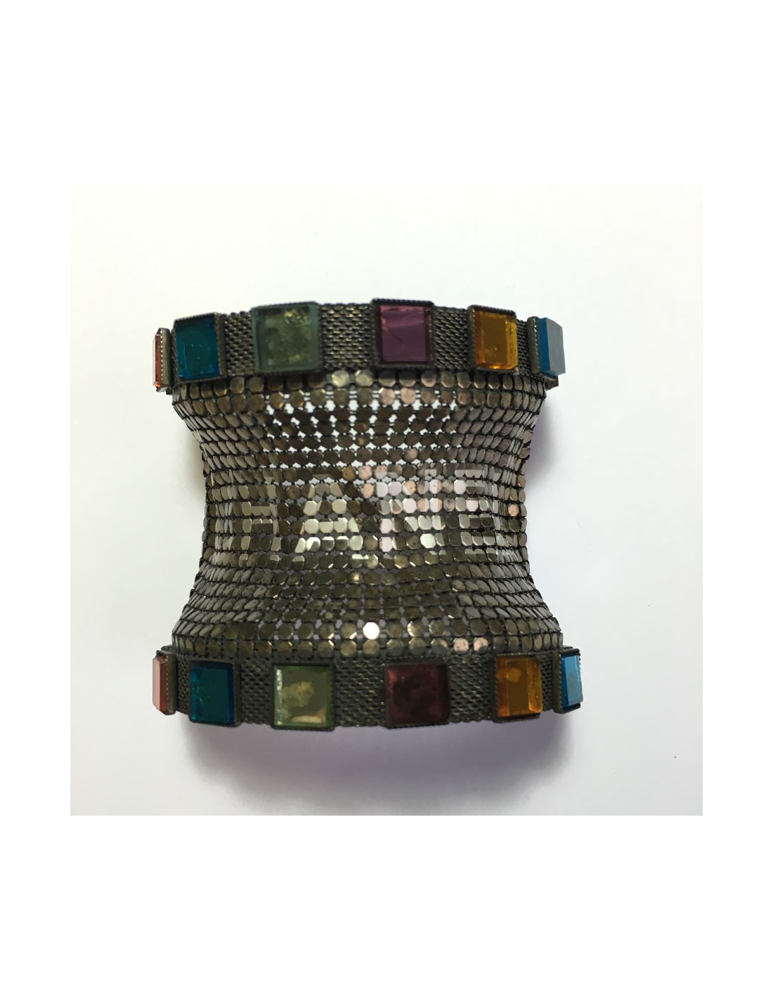 Great CHANEL couture cuff in aged silver metal and chainmail. Bracelet embellished with small square pellets of transparent colors. Inscription CHANEL on the chain mail.