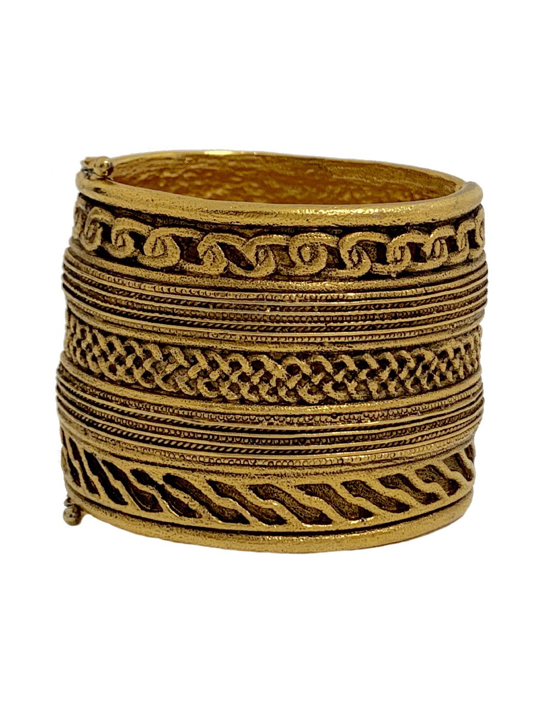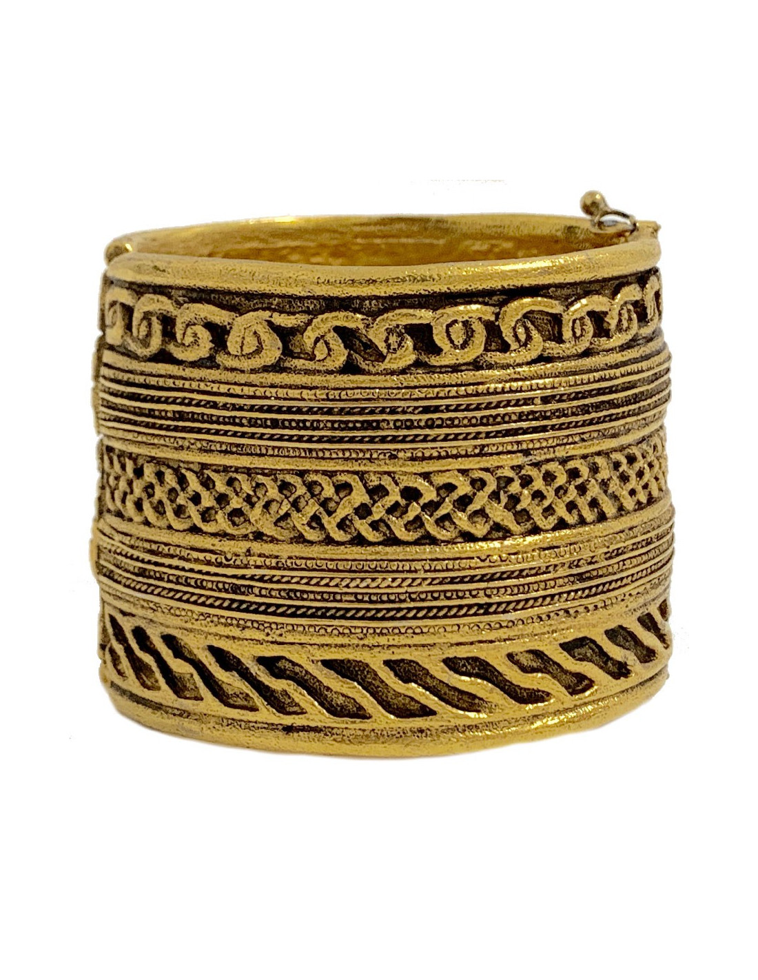 This cuff is in good condition. The gilding is slightly blackened on the outside. One of the safety clasps no longer closes.