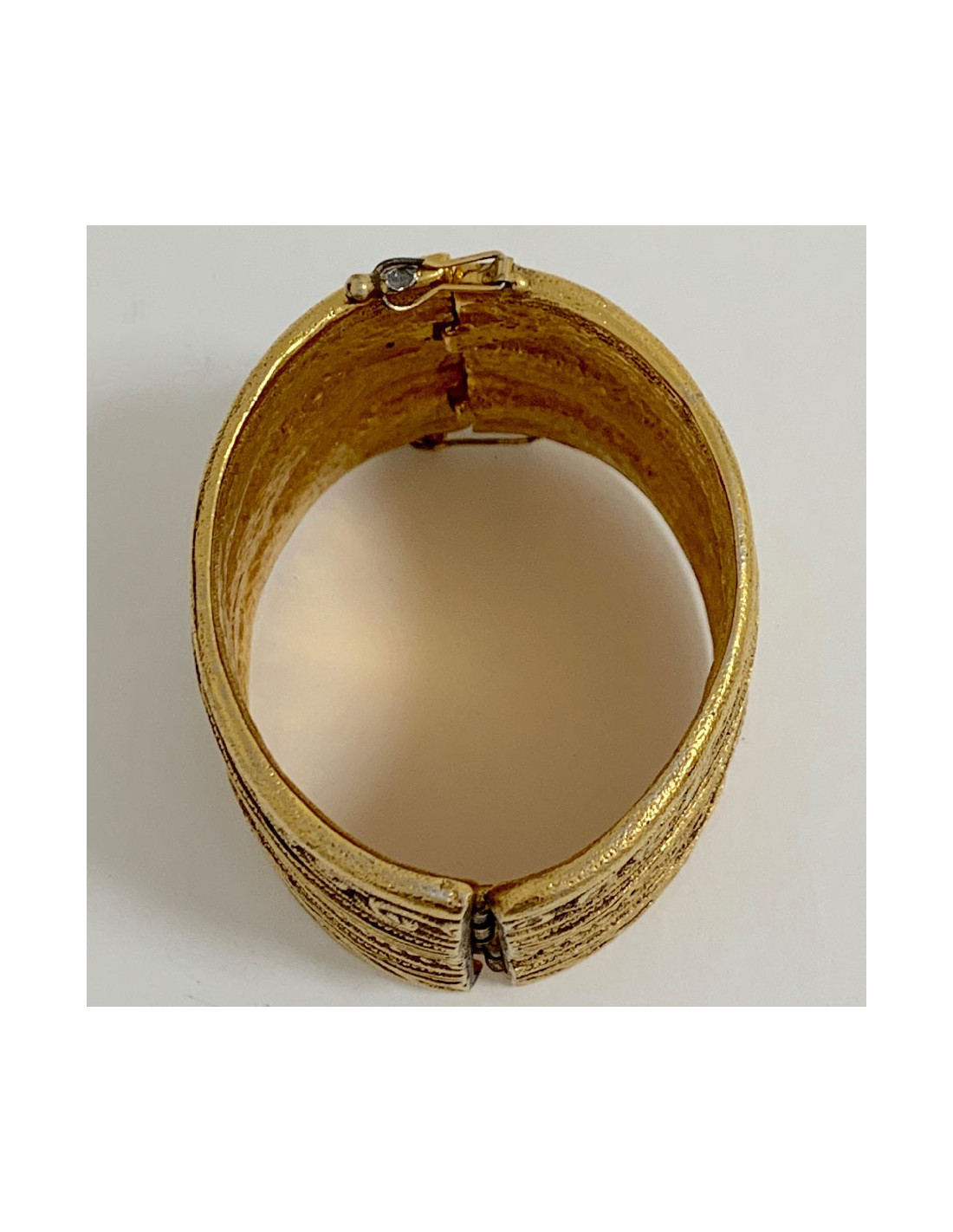 So 80's! Magnificent CHANEL couture cuff. Vintage jewel in gold-plated metal with an aged effect. Beautiful metalwork. Cuff articulated by springs. Safety clasp. One is slightly damaged and no longer closes. Made in France.
