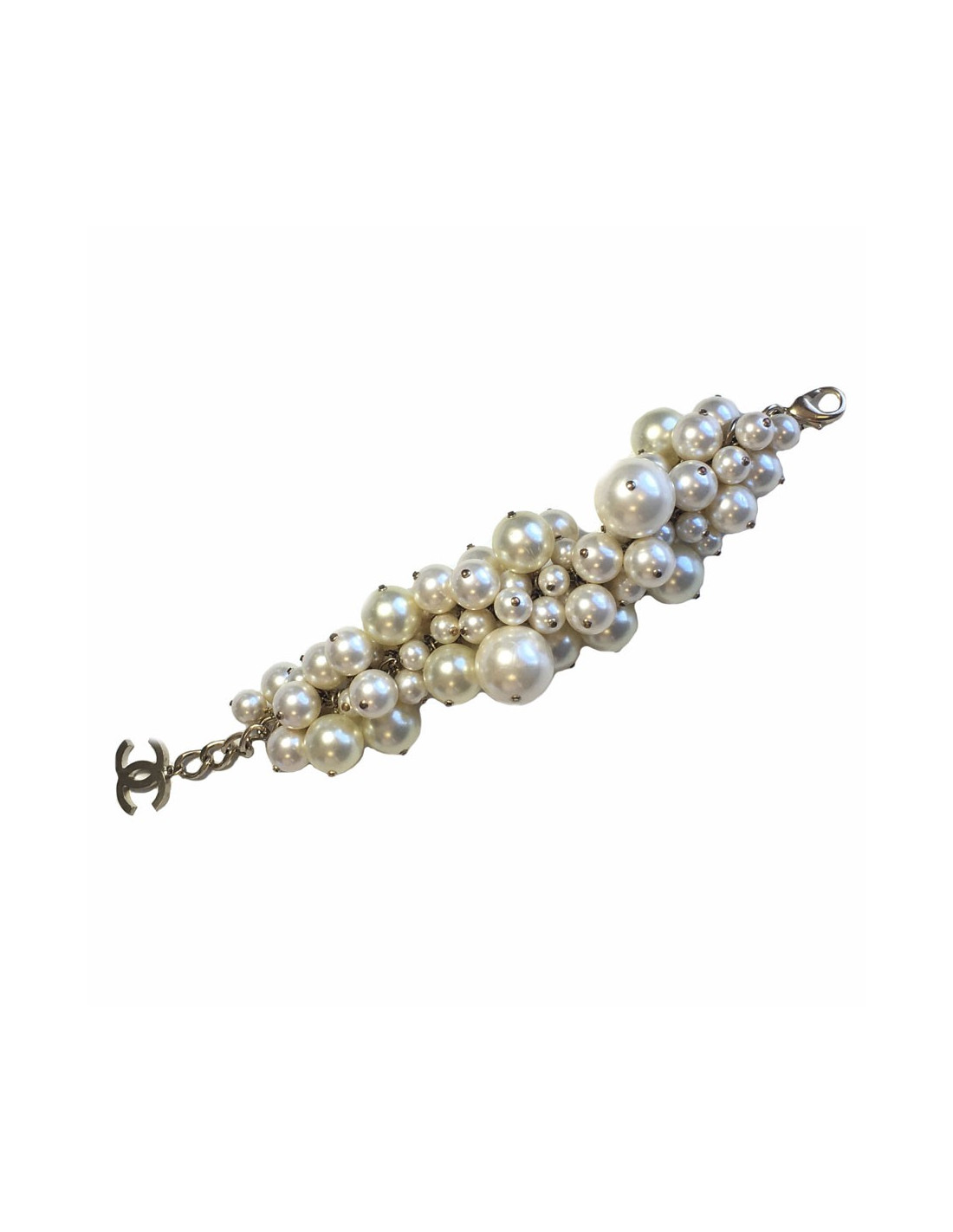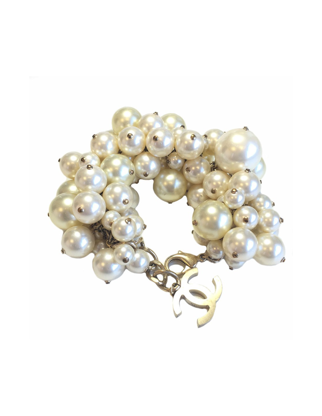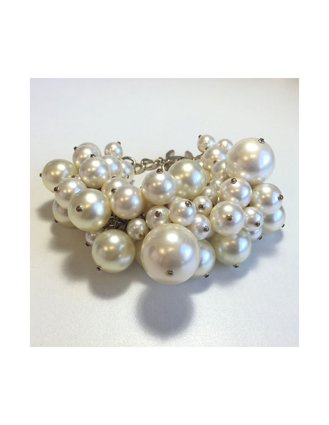 Beautiful and imposing bracelet CHANEL in large, medium and small Pearly beads. Metal Golden ending with a CC chain. In very good condition. Some scratches on some beads due to usage.
