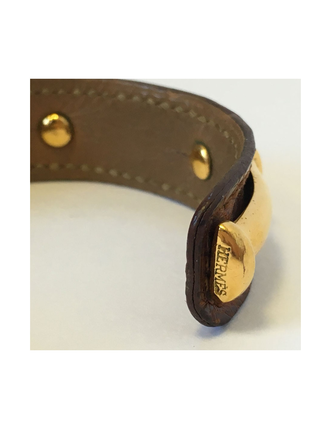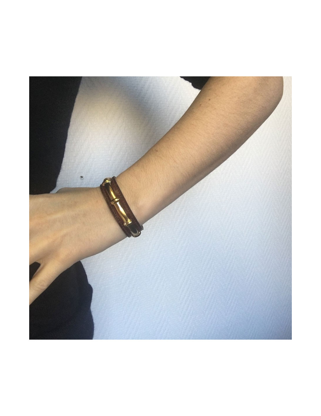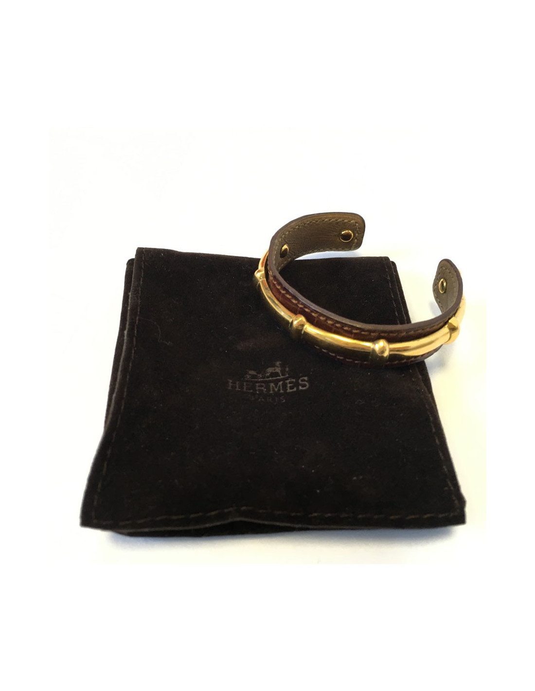 HERMES bracelet in brown leather and gold form metal bamboo. Rigid bracelet. In very good condition. Of small micro scratches on the jewelry. Name of the trade mark engraved on one end.