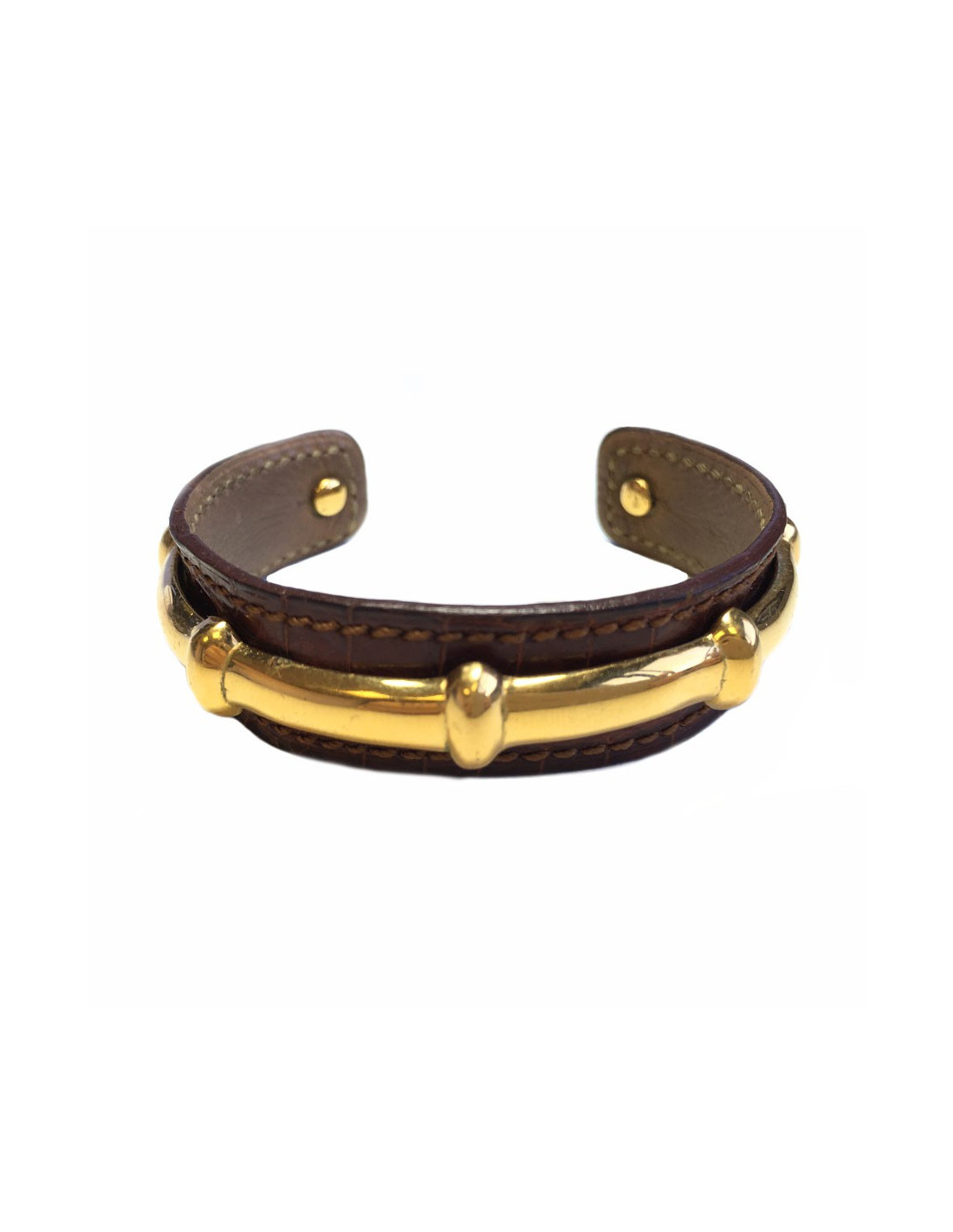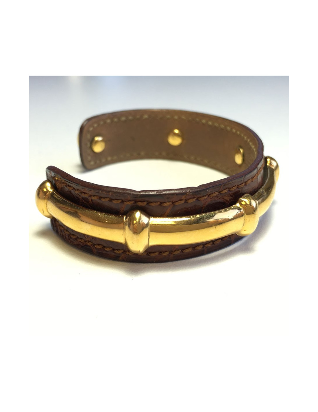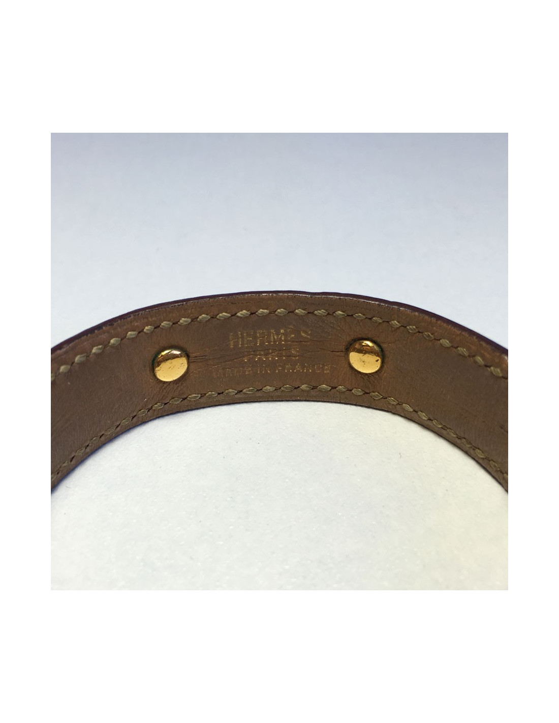 HERMES bracelet in brown leather and gold form metal bamboo. Rigid bracelet. In very good condition. Of small micro scratches on the jewelry. Name of the trade mark engraved on one end.
