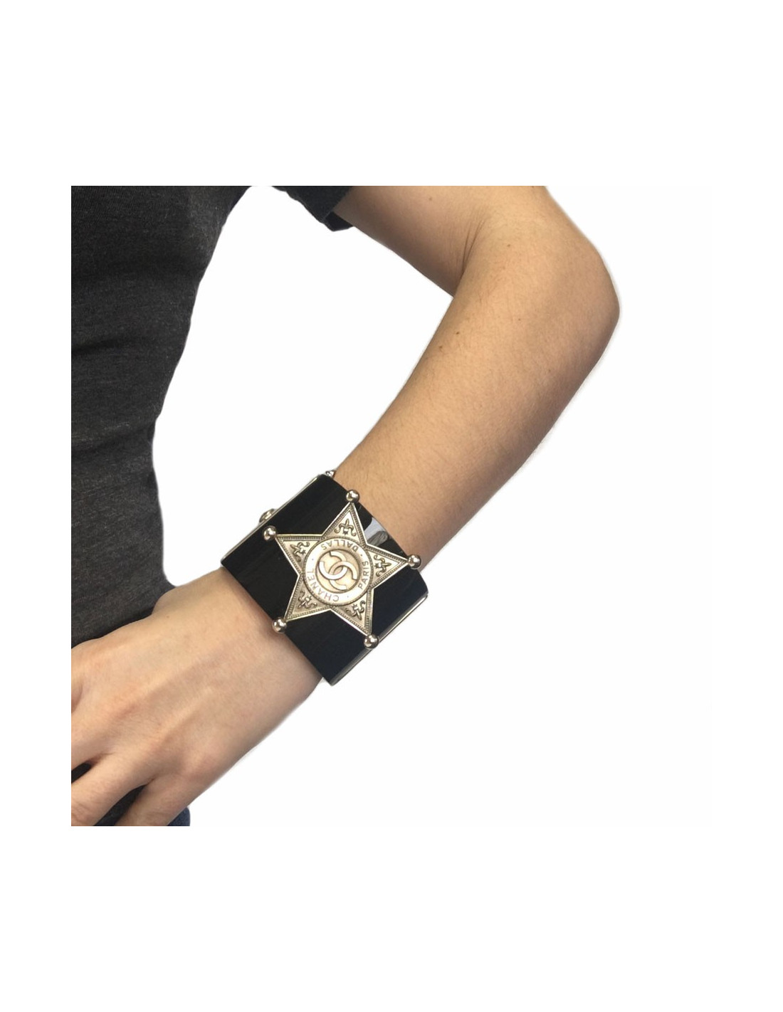 Gorgeous CHANEL "Paris-Dallas" cuff in black resin and jewellery gold metal. A Sheriff star on the front with the inscriptions CHANEL - PARIS - DALLAS.